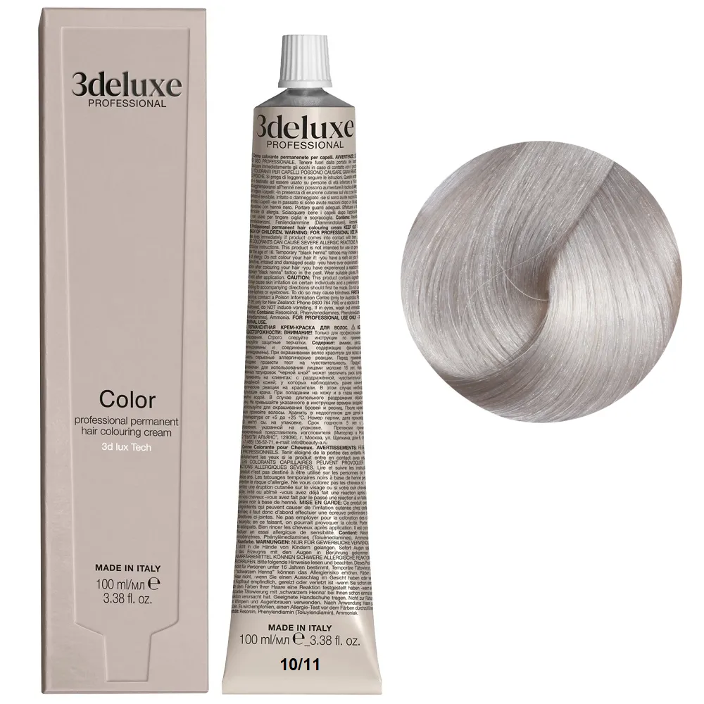 Професійна стійка кремова фарба для волосся Permanent Hair Color 3deluxe з неймовірним відбиттям світла та чудовим захистом, забезпечує волоссю неперевершену якість. Містить технологію 3D Lux, яка забезпечує насичений, яскравий, багатогранний колір: Особливості продукту: 10/11 платиновий блондин інтенсивний попелястий Фарба для волосся, 100 мл Permanent Hair Color 3Deluxe Professional Активні компоненти: 10/11 платиновий блондин інтенсивний попелястий Фарба для волосся, 100 мл Permanent Hair Color 3Deluxe Professional Застосування: 10/11 платиновий блондин інтенсивний попелястий Фарба для волосся, 100 мл Permanent Hair Color 3Deluxe Professional Змішайте в пластмасовому посуді крему-фарбу Color 3deluxe з кремом-окислювачем 1,5%, 3%, 6%, 9% або 12%. Пропорції змішування: для основної палітри відтінків - 1:1,5, для освітлювального ряду - 1:2, для більш насиченого кольору - 1:1. Час витримки залежить від бажаного результату. Важливо! Продукт для професійного застосування. Уважно ознайомтесь з інструкцією.Фарба для волосся Permanent Hair Color 3deluxe Professional