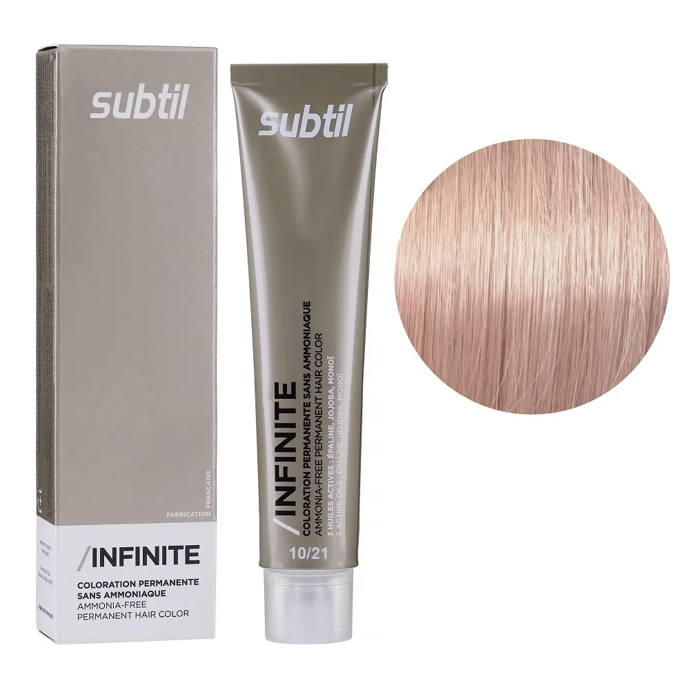 Subtil Infinite - фарба без вмісту аміаку нового покоління, що містить щонайменше 78% інгредієнтів природного походження та трилогію дорогоцінних олій: жожоба, моної, кукурудзяної. Забезпечує 100% зафарбовування сивини, супер блиск та супер стійкість. Безаміачна фарба додає волоссю стійкий і насичений колір, при цьому не ушкоджує і не висушує його. Олії, що входять до складу зволожують і ущільнюють волосся, роблять його блискучим і шовковистим. Щадна формула підходить навіть власницям чутливої шкіри голови. Так само фарба здатна освітлити волосся до трьох рівнів, що є революцією в світі безаміачних фарб. Розкішний колір, гладкість і здоровий блиск без шкоди для волосся. Застосування: 10/21 дуже світлий блондин перламутрово-попелястий Безаміачна стійка крем-фарба для волосся, 60 мл Permanent Hair Color INFINITE SUBTIL Крем-фарбу потрібно наносити на брудне сухе волосся. Фарбу слід змивати ретельно до повної прозорості води. Час витримки: 10/21 дуже світлий блондин перламутрово-попелястий Безаміачна стійка крем-фарба для волосся, 60 мл Permanent Hair Color INFINITE SUBTIL Витримати на волоссі від 30 до 35 хвилин, при наявності сивого волосся час впливу можна збільшити на 10 хвилин. Застосовувати фарбу слід, суворо дотримуючись інструкції, яка додається до кожної упаковки.Безаміачна стійка крем-фарба для волосся Permanent Hair Color INFINITE SUBTIL