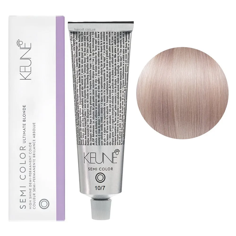Keune Semi Color - це інноваційна безаміачна крем-фарба для волосся, створена на основі технології Silsoft, що забезпечує стійкий результат без шкоди для структури волосся. Засіб ідеально підходить для тонування, освіження кольору та фарбування до 70% сивини. Формула нового покоління містить активні компоненти, які м’яко відновлюють природний відтінок, роблять волосся гладким, м’яким і еластичним. Завдяки нейтральному pH та відсутності аміаку, фарба підходить навіть для чутливої шкіри голови та волосся після хімічних процедур. Особливості продукту: 10/7 Платиновий блондин фіолетовий Фарба для тонування волосся без аміаку, 60 мл Demi-Permanent Color SЕМІ COLOR KEUNE Застосування: 10/7 Платиновий блондин фіолетовий Фарба для тонування волосся без аміаку, 60 мл Demi-Permanent Color SЕМІ COLOR KEUNE Фарбу Keune Semi Color слід змішати з Activator Semi Color (2.25%) або Activator Intense Semi Color (3%) у співвідношенні 1:2. Час витримки 20 хвилин. Продукт для професійного використання. Уважно ознайомтесь з офіційною інструкцією.Фарба для тонування волосся без аміаку Demi-Permanent Color SЕМІ COLOR KEUNE
