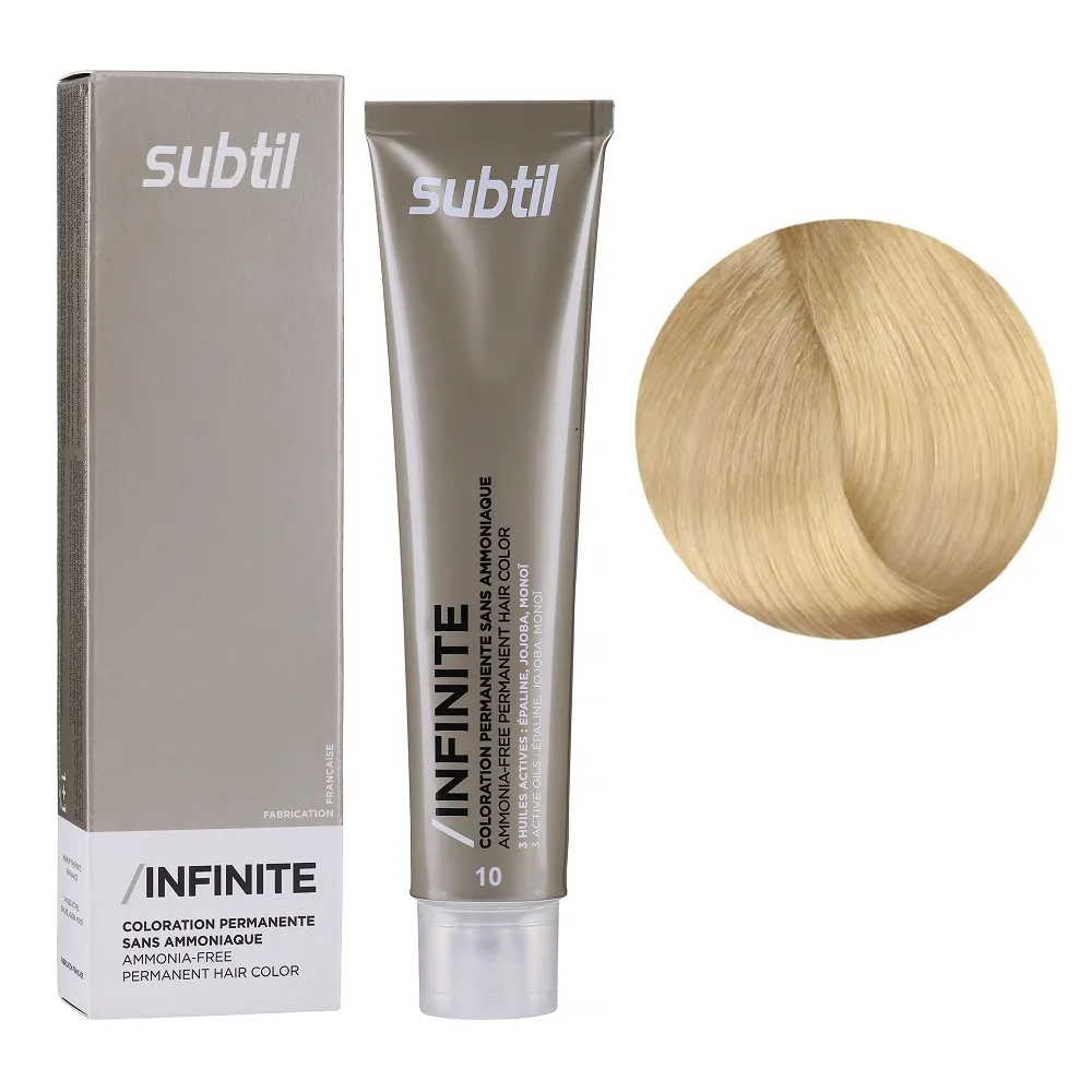 Subtil Infinite - фарба без вмісту аміаку нового покоління, що містить щонайменше 78% інгредієнтів природного походження та трилогію дорогоцінних олій: жожоба, моної, кукурудзяної. Забезпечує 100% зафарбовування сивини, супер блиск та супер стійкість. Безаміачна фарба додає волоссю стійкий і насичений колір, при цьому не ушкоджує і не висушує його. Олії, що входять до складу зволожують і ущільнюють волосся, роблять його блискучим і шовковистим. Щадна формула підходить навіть власницям чутливої шкіри голови. Так само фарба здатна освітлити волосся до трьох рівнів, що є революцією в світі безаміачних фарб. Розкішний колір, гладкість і здоровий блиск без шкоди для волосся. Застосування: 10 екстрасвітлий блондин Безаміачна стійка крем-фарба для волосся, 60 мл Permanent Hair Color INFINITE SUBTIL Крем-фарбу потрібно наносити на брудне сухе волосся. Фарбу слід змивати ретельно до повної прозорості води. Час витримки: 10 екстрасвітлий блондин Безаміачна стійка крем-фарба для волосся, 60 мл Permanent Hair Color INFINITE SUBTIL Витримати на волоссі від 30 до 35 хвилин, при наявності сивого волосся час впливу можна збільшити на 10 хвилин. Застосовувати фарбу слід, суворо дотримуючись інструкції, яка додається до кожної упаковки.Безаміачна крем-фарба для волосся Permanent Hair Color INFINITE SUBTIL