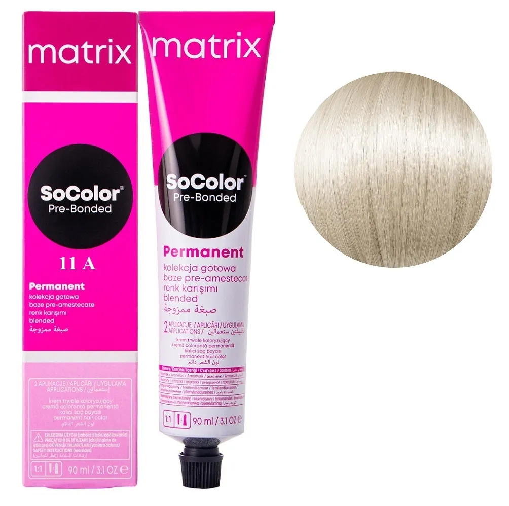 SoColor Pre-Bonded Cream Permanent- це оновлена версія легендарної фарби від бренду MATRIX, яка поєднує інтенсивний колір, тривалу стійкість та інноваційний догляд. Завдяки сучасній формулі з технологією Pre-Bonded фарба одночасно дарує насичений відтінок і зміцнює внутрішні зв’язки волосся, запобігаючи ламкості та пошкодженням у процесі фарбування. Особливості продукту: 11A ультра світлий блондин попелястий, 90 мл SoColor Pre-Bonded MATRIX (оновлений дизайн) SoColor Pre-Bonded містить компоненти, які відновлюють структуру волосини та зберігають природний рівень зволоження. Завдяки цьому після фарбування волосся виглядає м’яким, блискучим і доглянутим. Застосування: 11A ультра світлий блондин попелястий, 90 мл SoColor Pre-Bonded MATRIX (оновлений дизайн) Фарба SoColor Pre-Bonded MATRIX змішується з окисником Matrix Cream Developer у пропорції 1:1. Концентрація обирається в залежності від колористичної задачі. Суміш наноситься на сухе немите волосся. Час витримки: 35–45 хвилин залежно від базового кольору та бажаного результату. Після завершення процесу фарбування волосся ретельно промити водою до прозорості, нанести шампунь для фарбованого волосся та завершити догляд кондиціонером або маскою. Результат: Ви отримуєте стійкий, глибокий і блискучий колір, який зберігається тривалий час. Навіть після багаторазового миття голови відтінок виглядає свіжим, а волосся залишається еластичним і сильним. SoColor Pre-Bonded MATRIX - це вибір професіоналів, які прагнуть дарувати клієнтам ідеальний колір та дбати про здоров’я волосся під час фарбування.Крем-фарба для волосся SoColor Pre-Bonded Cream Permanent MATRIX