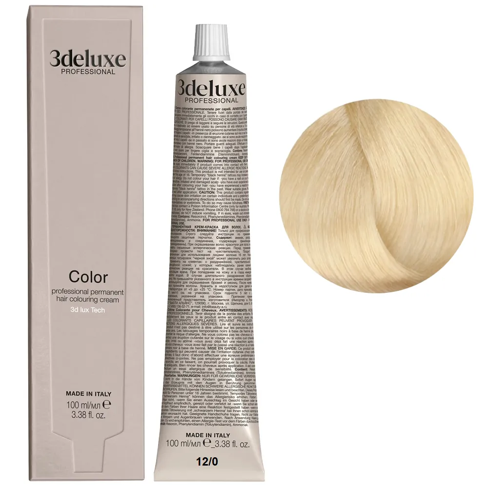 Професійна стійка кремова фарба для волосся Permanent Hair Color 3deluxe з неймовірним відбиттям світла та чудовим захистом, забезпечує волоссю неперевершену якість. Містить технологію 3D Lux, яка забезпечує насичений, яскравий, багатогранний колір: Особливості продукту: 12/0 спеціальний блондин натуральний Фарба для волосся, 100 мл Permanent Hair Color 3Deluxe Professional Активні компоненти: 12/0 спеціальний блондин натуральний Фарба для волосся, 100 мл Permanent Hair Color 3Deluxe Professional Застосування: 12/0 спеціальний блондин натуральний Фарба для волосся, 100 мл Permanent Hair Color 3Deluxe Professional Змішайте в пластмасовому посуді крему-фарбу Color 3deluxe з кремом-окислювачем 1,5%, 3%, 6%, 9% або 12%. Пропорції змішування: для основної палітри відтінків - 1:1,5, для освітлювального ряду - 1:2, для більш насиченого кольору - 1:1. Час витримки залежить від бажаного результату. Важливо! Продукт для професійного застосування. Уважно ознайомтесь з інструкцією.Фарба для волосся Permanent Hair Color 3deluxe Professional