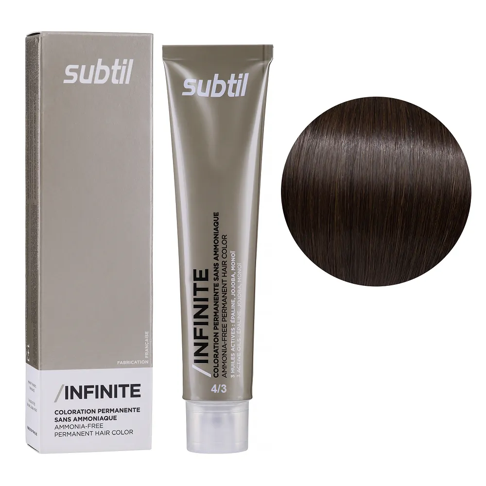Subtil Infinite - фарба без вмісту аміаку нового покоління, що містить щонайменше 78% інгредієнтів природного походження та трилогію дорогоцінних олій: жожоба, моної, кукурудзяної. Забезпечує 100% зафарбовування сивини, супер блиск та супер стійкість. Безаміачна фарба додає волоссю стійкий і насичений колір, при цьому не ушкоджує і не висушує його. Олії, що входять до складу зволожують і ущільнюють волосся, роблять його блискучим і шовковистим. Щадна формула підходить навіть власницям чутливої шкіри голови. Так само фарба здатна освітлити волосся до трьох рівнів, що є революцією в світі безаміачних фарб. Розкішний колір, гладкість і здоровий блиск без шкоди для волосся. Застосування: 4/3 шатен золотистий Безаміачна стійка крем-фарба для волосся, 60 мл Permanent Hair Color INFINITE SUBTIL Крем-фарбу потрібно наносити на брудне сухе волосся. Фарбу слід змивати ретельно до повної прозорості води. Час витримки: 4/3 шатен золотистий Безаміачна стійка крем-фарба для волосся, 60 мл Permanent Hair Color INFINITE SUBTIL Витримати на волоссі від 30 до 35 хвилин, при наявності сивого волосся час впливу можна збільшити на 10 хвилин. Застосовувати фарбу слід, суворо дотримуючись інструкції, яка додається до кожної упаковки.Безаміачна крем-фарба для волосся Permanent Hair Color INFINITE SUBTIL
