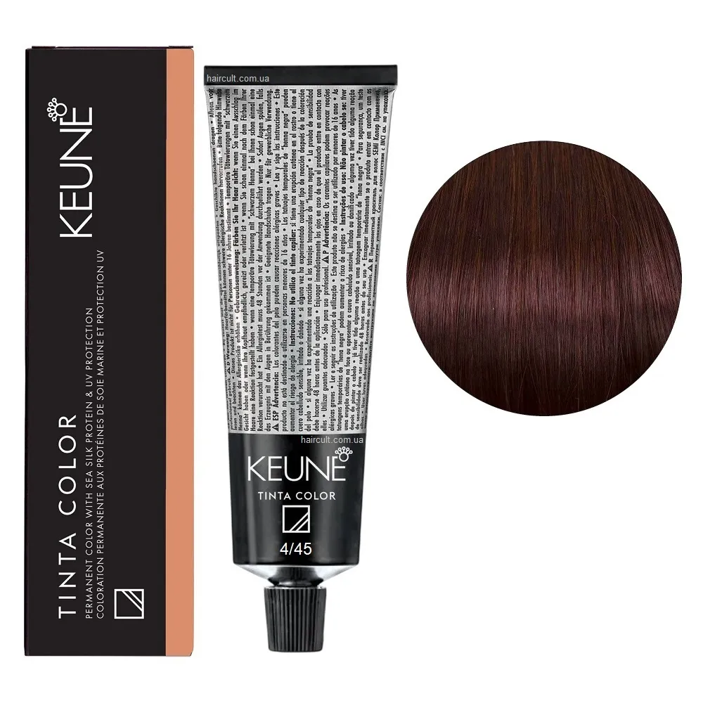 Tinta Color Keune - це преміальна перманентна крем-фарба, яка забезпечує 100% покриття сивини, інтенсивний колір та ефект догляду після кожного фарбування. Унікальна формула з протеїнами шовку глибоко кондиціонує волосся, зберігає його м’якість і блиск. Завдяки вмісту бджолиного воску, фарба не тече та рівномірно розподіляється по всій довжині. Фарба доступна в широкій палітрі - від природних тонів до виразних і насичених кольорів. Підходить для будь-якого типу волосся - як натурального, так і фарбованого. Спеціальні серії Tinta Color: Переваги фарби Keune Tinta Color: 4/45 Середньо-коричневий мідно-махагоновий Фарба перманентна для волосся, 60 мл Permanent Color TINTA COLOR KEUNE Застосування: 4/45 Середньо-коричневий мідно-махагоновий Фарба перманентна для волосся, 60 мл Permanent Color TINTA COLOR KEUNE Змішайте з окислювачем Cream Developer TINTA KEUNE у пропорції 1:1. Важливо! Продукт для професійного використання. Уважно ознайомтесь з офіційною інструкцією.Фарба перманентна для волосся Permanent Color Sea Silk Protein TINTA COLOR KEUNE