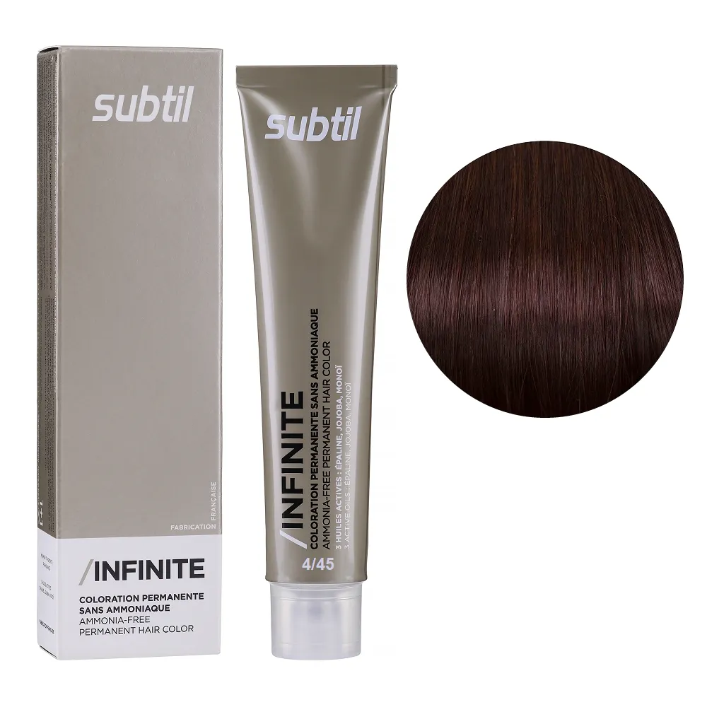 Subtil Infinite - фарба без вмісту аміаку нового покоління, що містить щонайменше 78% інгредієнтів природного походження та трилогію дорогоцінних олій: жожоба, моної, кукурудзяної. Забезпечує 100% зафарбовування сивини, супер блиск та супер стійкість. Безаміачна фарба додає волоссю стійкий і насичений колір, при цьому не ушкоджує і не висушує його. Олії, що входять до складу зволожують і ущільнюють волосся, роблять його блискучим і шовковистим. Щадна формула підходить навіть власницям чутливої шкіри голови. Так само фарба здатна освітлити волосся до трьох рівнів, що є революцією в світі безаміачних фарб. Розкішний колір, гладкість і здоровий блиск без шкоди для волосся. Застосування: 4/45 мідно-червоне дерево коричневе Безаміачна стійка крем-фарба для волосся, 60 мл Permanent Hair Color INFINITE SUBTIL Крем-фарбу потрібно наносити на брудне сухе волосся. Фарбу слід змивати ретельно до повної прозорості води. Час витримки: 4/45 мідно-червоне дерево коричневе Безаміачна стійка крем-фарба для волосся, 60 мл Permanent Hair Color INFINITE SUBTIL Витримати на волоссі від 30 до 35 хвилин, при наявності сивого волосся час впливу можна збільшити на 10 хвилин. Застосовувати фарбу слід, суворо дотримуючись інструкції, яка додається до кожної упаковки.Безаміачна крем-фарба для волосся Permanent Hair Color INFINITE SUBTIL