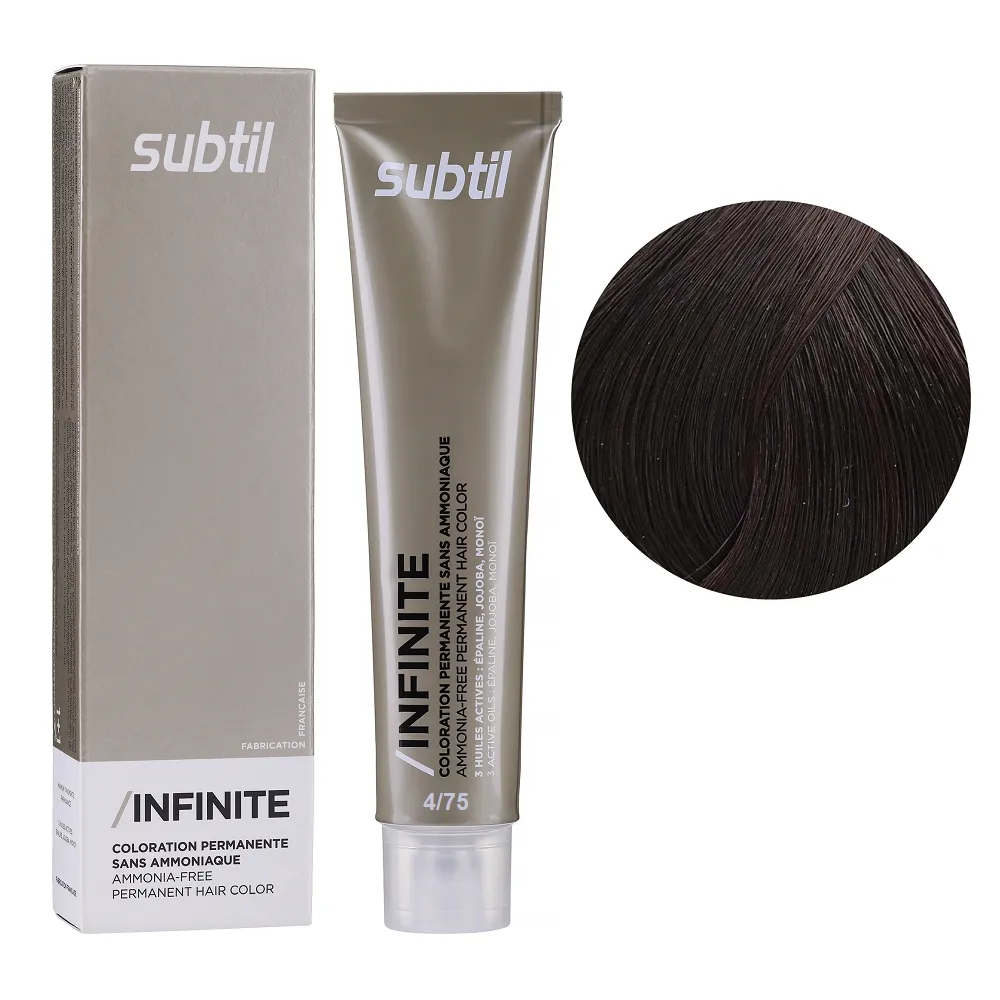 Subtil Infinite - фарба без вмісту аміаку нового покоління, що містить щонайменше 78% інгредієнтів природного походження та трилогію дорогоцінних олій: жожоба, моної, кукурудзяної. Забезпечує 100% зафарбовування сивини, супер блиск та супер стійкість. Безаміачна фарба додає волоссю стійкий і насичений колір, при цьому не ушкоджує і не висушує його. Олії, що входять до складу зволожують і ущільнюють волосся, роблять його блискучим і шовковистим. Щадна формула підходить навіть власницям чутливої шкіри голови. Так само фарба здатна освітлити волосся до трьох рівнів, що є революцією в світі безаміачних фарб. Розкішний колір, гладкість і здоровий блиск без шкоди для волосся. Застосування: 4/75 шатен коричневий червоне дерево Безаміачна стійка крем-фарба для волосся, 60 мл Permanent Hair Color INFINITE SUBTIL Крем-фарбу потрібно наносити на брудне сухе волосся. Фарбу слід змивати ретельно до повної прозорості води. Час витримки: 4/75 шатен коричневий червоне дерево Безаміачна стійка крем-фарба для волосся, 60 мл Permanent Hair Color INFINITE SUBTIL Витримати на волоссі від 30 до 35 хвилин, при наявності сивого волосся час впливу можна збільшити на 10 хвилин. Застосовувати фарбу слід, суворо дотримуючись інструкції, яка додається до кожної упаковки.Безаміачна стійка крем-фарба для волосся Permanent Hair Color INFINITE SUBTIL