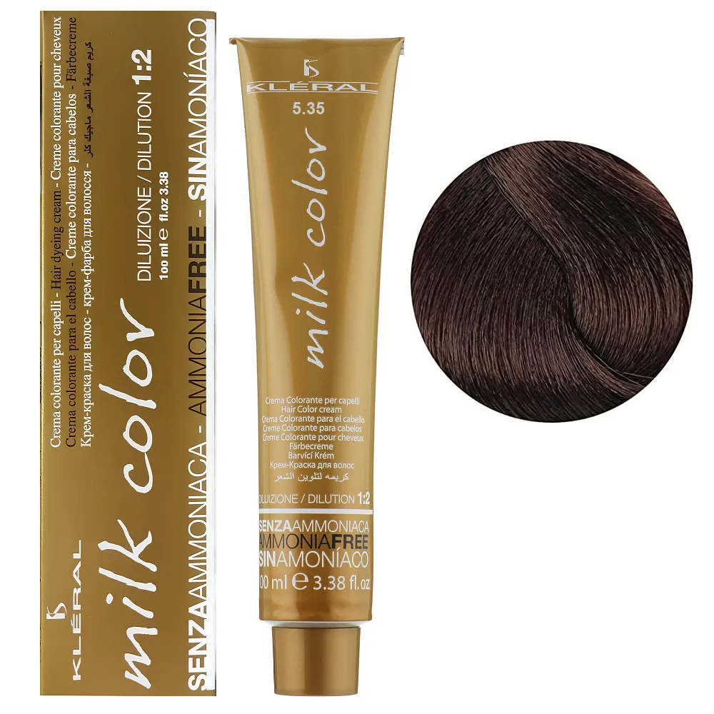 Безаміачна фарба Milk Color, розроблена італійською компанією Kleral System, представлена більше ніж 40 відтінками. Прекрасно забарвлює волосся, у тому числі і сиве (якщо сивини не більше 50%) у близькі до натуральних кольорів. Завдяки своєму щадному складу і компонентам, що доглядають, не пошкоджує структуру волосся, надає їм блиск і м`якість. Milk Color ідеально підходить для пошкодженого волосся. Тюбик містить 100 мл фарби та розрахований на 2 повні нанесення. Рекомендований окислювач - 20-vol стабілізований перекис водню. Для збільшення освітлювальної дії, використовуйте стабілізований перекис водню в 30- або 40-vol емульсії. Особливості продукту: 5/35 Світлий шатен мокко Крем-фарба для волосся перманентна без аміаку, 100 мл Milk Color KLERAL System Застосування: 5/35 Світлий шатен мокко Крем-фарба для волосся перманентна без аміаку, 100 мл Milk Color KLERAL System Продукт призначений для професійного використання. Уважно ознайомтесь з інструкцією.Крем-фарба для волосся перманентна без аміаку Milk Color KLERAL System