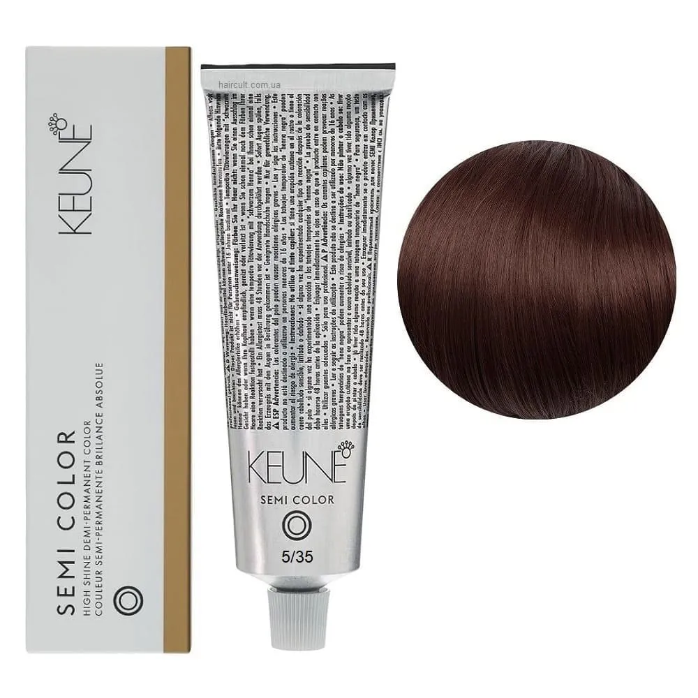 Keune Semi Color - це інноваційна безаміачна крем-фарба для волосся, створена на основі технології Silsoft, що забезпечує стійкий результат без шкоди для структури волосся. Засіб ідеально підходить для тонування, освіження кольору та фарбування до 70% сивини. Формула нового покоління містить активні компоненти, які м’яко відновлюють природний відтінок, роблять волосся гладким, м’яким і еластичним. Завдяки нейтральному pH та відсутності аміаку, фарба підходить навіть для чутливої шкіри голови та волосся після хімічних процедур. Особливості продукту: 5/35 Світло-коричневий золотисто-махагоновий Фарба для тонування волосся без аміаку, 60 мл Demi-Permanent Color SЕМІ COLOR KEUNE Застосування: 5/35 Світло-коричневий золотисто-махагоновий Фарба для тонування волосся без аміаку, 60 мл Demi-Permanent Color SЕМІ COLOR KEUNE Фарбу Keune Semi Color слід змішати з Activator Semi Color (2.25%) або Activator Intense Semi Color (3%) у співвідношенні 1:2. Час витримки 20 хвилин. Продукт для професійного використання. Уважно ознайомтесь з офіційною інструкцією.Фарба для тонування волосся без аміаку Demi-Permanent Color SЕМІ COLOR KEUNE