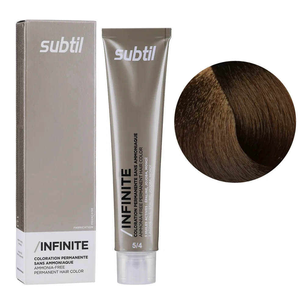 Subtil Infinite - фарба без вмісту аміаку нового покоління, що містить щонайменше 78% інгредієнтів природного походження та трилогію дорогоцінних олій: жожоба, моної, кукурудзяної. Забезпечує 100% зафарбовування сивини, супер блиск та супер стійкість. Безаміачна фарба додає волоссю стійкий і насичений колір, при цьому не ушкоджує і не висушує його. Олії, що входять до складу зволожують і ущільнюють волосся, роблять його блискучим і шовковистим. Щадна формула підходить навіть власницям чутливої шкіри голови. Так само фарба здатна освітлити волосся до трьох рівнів, що є революцією в світі безаміачних фарб. Розкішний колір, гладкість і здоровий блиск без шкоди для волосся. Застосування: 5/4 світлий шатен мідний Безаміачна стійка крем-фарба для волосся, 60 мл Permanent Hair Color INFINITE SUBTIL Крем-фарбу потрібно наносити на брудне сухе волосся. Фарбу слід змивати ретельно до повної прозорості води. Час витримки: 5/4 світлий шатен мідний Безаміачна стійка крем-фарба для волосся, 60 мл Permanent Hair Color INFINITE SUBTIL Витримати на волоссі від 30 до 35 хвилин, при наявності сивого волосся час впливу можна збільшити на 10 хвилин. Застосовувати фарбу слід, суворо дотримуючись інструкції, яка додається до кожної упаковки.Безаміачна стійка крем-фарба для волосся Permanent Hair Color INFINITE SUBTIL