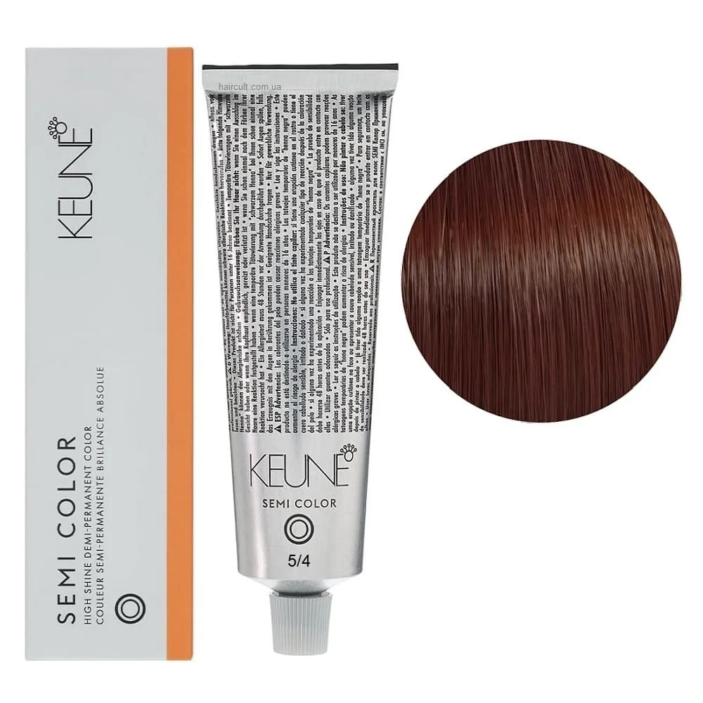 Keune Semi Color - це інноваційна безаміачна крем-фарба для волосся, створена на основі технології Silsoft, що забезпечує стійкий результат без шкоди для структури волосся. Засіб ідеально підходить для тонування, освіження кольору та фарбування до 70% сивини. Формула нового покоління містить активні компоненти, які м’яко відновлюють природний відтінок, роблять волосся гладким, м’яким і еластичним. Завдяки нейтральному pH та відсутності аміаку, фарба підходить навіть для чутливої шкіри голови та волосся після хімічних процедур. Особливості продукту: 5/4 Світло-коричневий мідний Фарба для тонування волосся без аміаку, 60 мл Demi-Permanent Color SЕМІ COLOR KEUNE Застосування: 5/4 Світло-коричневий мідний Фарба для тонування волосся без аміаку, 60 мл Demi-Permanent Color SЕМІ COLOR KEUNE Фарбу Keune Semi Color слід змішати з Activator Semi Color (2.25%) або Activator Intense Semi Color (3%) у співвідношенні 1:2. Час витримки 20 хвилин. Продукт для професійного використання. Уважно ознайомтесь з офіційною інструкцією.Фарба для тонування волосся без аміаку Demi-Permanent Color SЕМІ COLOR KEUNE