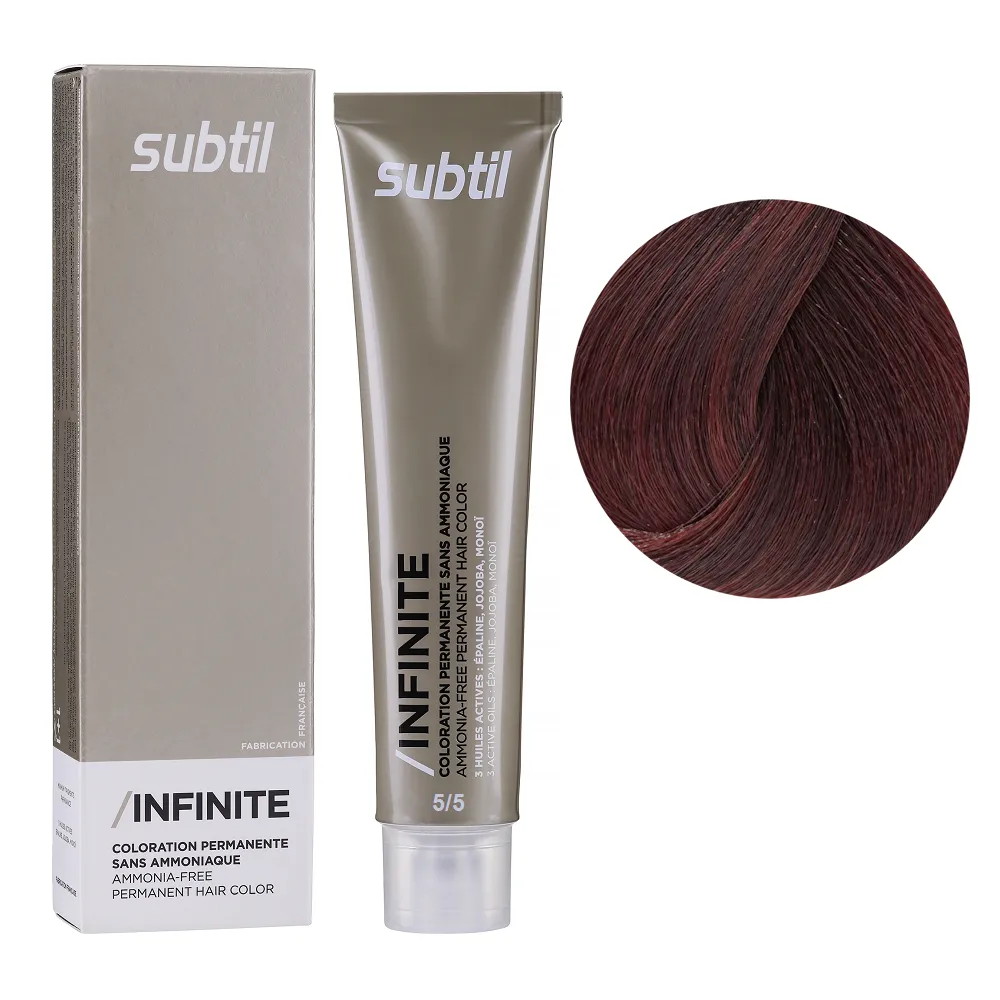 Subtil Infinite - фарба без вмісту аміаку нового покоління, що містить щонайменше 78% інгредієнтів природного походження та трилогію дорогоцінних олій: жожоба, моної, кукурудзяної. Забезпечує 100% зафарбовування сивини, супер блиск та супер стійкість. Безаміачна фарба додає волоссю стійкий і насичений колір, при цьому не ушкоджує і не висушує його. Олії, що входять до складу зволожують і ущільнюють волосся, роблять його блискучим і шовковистим. Щадна формула підходить навіть власницям чутливої шкіри голови. Так само фарба здатна освітлити волосся до трьох рівнів, що є революцією в світі безаміачних фарб. Розкішний колір, гладкість і здоровий блиск без шкоди для волосся. Застосування: 5/5 світлий шатен,червоне дерево Безаміачна стійка крем-фарба для волосся, 60 мл Permanent Hair Color INFINITE SUBTIL Крем-фарбу потрібно наносити на брудне сухе волосся. Фарбу слід змивати ретельно до повної прозорості води. Час витримки: 5/5 світлий шатен,червоне дерево Безаміачна стійка крем-фарба для волосся, 60 мл Permanent Hair Color INFINITE SUBTIL Витримати на волоссі від 30 до 35 хвилин, при наявності сивого волосся час впливу можна збільшити на 10 хвилин. Застосовувати фарбу слід, суворо дотримуючись інструкції, яка додається до кожної упаковки.Безаміачна стійка крем-фарба для волосся Permanent Hair Color INFINITE SUBTIL