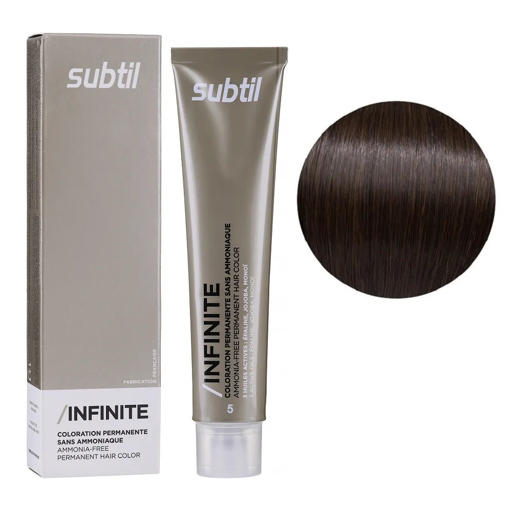 Subtil Infinite - фарба без вмісту аміаку нового покоління, що містить щонайменше 78% інгредієнтів природного походження та трилогію дорогоцінних олій: жожоба, моної, кукурудзяної. Забезпечує 100% зафарбовування сивини, супер блиск та супер стійкість. Безаміачна фарба додає волоссю стійкий і насичений колір, при цьому не ушкоджує і не висушує його. Олії, що входять до складу зволожують і ущільнюють волосся, роблять його блискучим і шовковистим. Щадна формула підходить навіть власницям чутливої шкіри голови. Так само фарба здатна освітлити волосся до трьох рівнів, що є революцією в світі безаміачних фарб. Розкішний колір, гладкість і здоровий блиск без шкоди для волосся. Застосування: 5 світлий шатен Безаміачна стійка крем-фарба для волосся, 60 мл Permanent Hair Color INFINITE SUBTIL Крем-фарбу потрібно наносити на брудне сухе волосся. Фарбу слід змивати ретельно до повної прозорості води. Час витримки: 5 світлий шатен Безаміачна стійка крем-фарба для волосся, 60 мл Permanent Hair Color INFINITE SUBTIL Витримати на волоссі від 30 до 35 хвилин, при наявності сивого волосся час впливу можна збільшити на 10 хвилин. Застосовувати фарбу слід, суворо дотримуючись інструкції, яка додається до кожної упаковки.Безаміачна крем-фарба для волосся Permanent Hair Color INFINITE SUBTIL