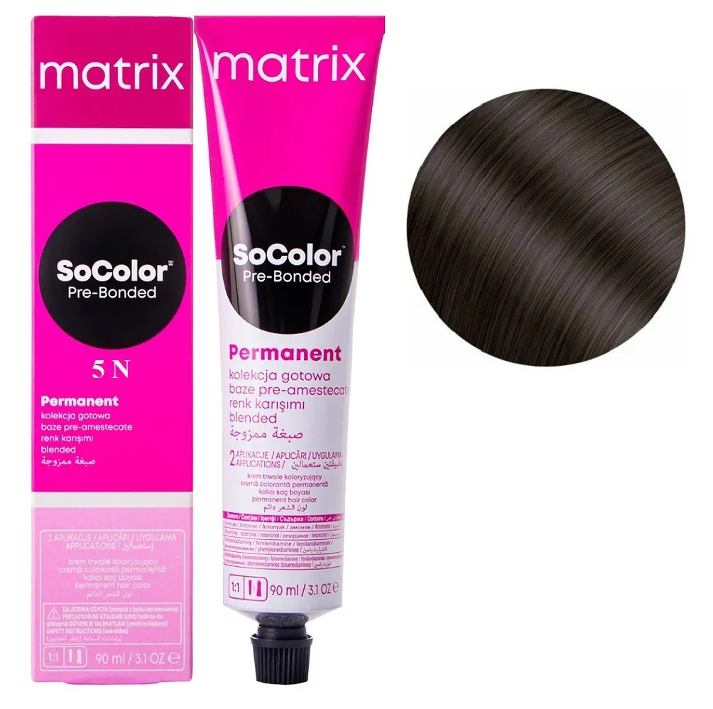 SoColor Pre-Bonded Cream Permanent- це оновлена версія легендарної фарби від бренду MATRIX, яка поєднує інтенсивний колір, тривалу стійкість та інноваційний догляд. Завдяки сучасній формулі з технологією Pre-Bonded фарба одночасно дарує насичений відтінок і зміцнює внутрішні зв’язки волосся, запобігаючи ламкості та пошкодженням у процесі фарбування. Особливості продукту: 5N світлий шатен натуральний Крем-фарба для волосся, 90 мл SoColor Pre-Bonded MATRIX (оновлений дизайн) SoColor Pre-Bonded містить компоненти, які відновлюють структуру волосини та зберігають природний рівень зволоження. Завдяки цьому після фарбування волосся виглядає м’яким, блискучим і доглянутим. Застосування: 5N світлий шатен натуральний Крем-фарба для волосся, 90 мл SoColor Pre-Bonded MATRIX (оновлений дизайн) Фарба SoColor Pre-Bonded MATRIX змішується з окисником Matrix Cream Developer у пропорції 1:1. Концентрація обирається в залежності від колористичної задачі. Суміш наноситься на сухе немите волосся. Час витримки: 35–45 хвилин залежно від базового кольору та бажаного результату. Після завершення процесу фарбування волосся ретельно промити водою до прозорості, нанести шампунь для фарбованого волосся та завершити догляд кондиціонером або маскою. Результат: Ви отримуєте стійкий, глибокий і блискучий колір, який зберігається тривалий час. Навіть після багаторазового миття голови відтінок виглядає свіжим, а волосся залишається еластичним і сильним. SoColor Pre-Bonded MATRIX - це вибір професіоналів, які прагнуть дарувати клієнтам ідеальний колір та дбати про здоров’я волосся під час фарбування.Крем-фарба для волосся SoColor Pre-Bonded Cream Permanent MATRIX