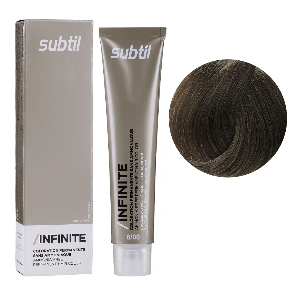 Subtil Infinite - фарба без вмісту аміаку нового покоління, що містить щонайменше 78% інгредієнтів природного походження та трилогію дорогоцінних олій: жожоба, моної, кукурудзяної. Забезпечує 100% зафарбовування сивини, супер блиск та супер стійкість. Безаміачна фарба додає волоссю стійкий і насичений колір, при цьому не ушкоджує і не висушує його. Олії, що входять до складу зволожують і ущільнюють волосся, роблять його блискучим і шовковистим. Щадна формула підходить навіть власницям чутливої шкіри голови. Так само фарба здатна освітлити волосся до трьох рівнів, що є революцією в світі безаміачних фарб. Розкішний колір, гладкість і здоровий блиск без шкоди для волосся. Застосування: 6/00 темний блондин інтенсивний Безаміачна стійка крем-фарба для волосся, 60 мл Permanent Hair Color INFINITE SUBTIL Крем-фарбу потрібно наносити на брудне сухе волосся. Фарбу слід змивати ретельно до повної прозорості води. Час витримки: 6/00 темний блондин інтенсивний Безаміачна стійка крем-фарба для волосся, 60 мл Permanent Hair Color INFINITE SUBTIL Витримати на волоссі від 30 до 35 хвилин, при наявності сивого волосся час впливу можна збільшити на 10 хвилин. Застосовувати фарбу слід, суворо дотримуючись інструкції, яка додається до кожної упаковки.Безаміачна крем-фарба для волосся Permanent Hair Color INFINITE SUBTIL
