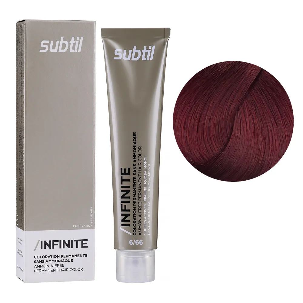 Subtil Infinite - фарба без вмісту аміаку нового покоління, що містить щонайменше 78% інгредієнтів природного походження та трилогію дорогоцінних олій: жожоба, моної, кукурудзяної. Забезпечує 100% зафарбовування сивини, супер блиск та супер стійкість. Безаміачна фарба додає волоссю стійкий і насичений колір, при цьому не ушкоджує і не висушує його. Олії, що входять до складу зволожують і ущільнюють волосся, роблять його блискучим і шовковистим. Щадна формула підходить навіть власницям чутливої шкіри голови. Так само фарба здатна освітлити волосся до трьох рівнів, що є революцією в світі безаміачних фарб. Розкішний колір, гладкість і здоровий блиск без шкоди для волосся. Застосування: 6/66 темний блондин інтенсивний червоний Безаміачна стійка крем-фарба для волосся, 60 мл Permanent Hair Color INFINITE SUBTIL Крем-фарбу потрібно наносити на брудне сухе волосся. Фарбу слід змивати ретельно до повної прозорості води. Час витримки: 6/66 темний блондин інтенсивний червоний Безаміачна стійка крем-фарба для волосся, 60 мл Permanent Hair Color INFINITE SUBTIL Витримати на волоссі від 30 до 35 хвилин, при наявності сивого волосся час впливу можна збільшити на 10 хвилин. Застосовувати фарбу слід, суворо дотримуючись інструкції, яка додається до кожної упаковки.Безаміачна стійка крем-фарба для волосся Permanent Hair Color INFINITE SUBTIL