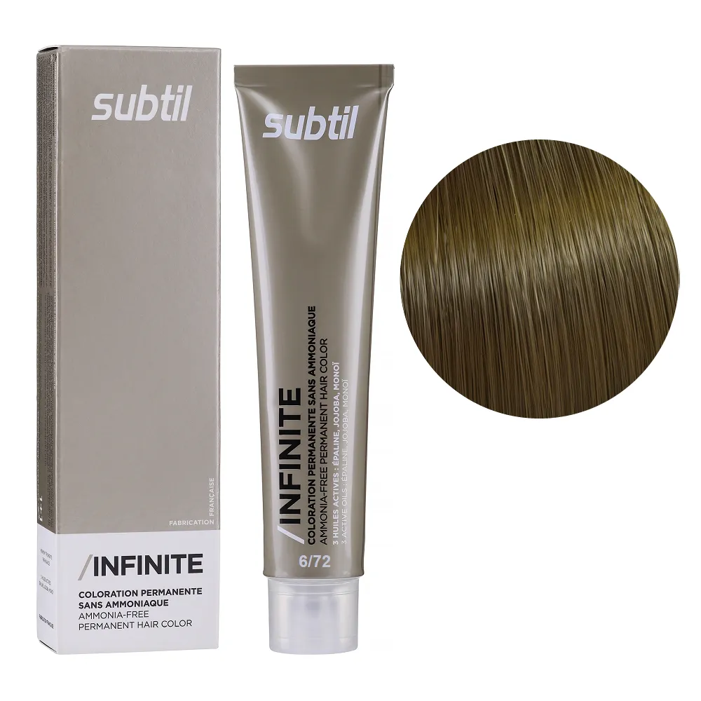 Subtil Infinite - фарба без вмісту аміаку нового покоління, що містить щонайменше 78% інгредієнтів природного походження та трилогію дорогоцінних олій: жожоба, моної, кукурудзяної. Забезпечує 100% зафарбовування сивини, супер блиск та супер стійкість. Безаміачна фарба додає волоссю стійкий і насичений колір, при цьому не ушкоджує і не висушує його. Олії, що входять до складу зволожують і ущільнюють волосся, роблять його блискучим і шовковистим. Щадна формула підходить навіть власницям чутливої шкіри голови. Так само фарба здатна освітлити волосся до трьох рівнів, що є революцією в світі безаміачних фарб. Розкішний колір, гладкість і здоровий блиск без шкоди для волосся. Застосування: 6/72 темний блондин коричневий перламутровий Безаміачна стійка крем-фарба для волосся, 60 мл Permanent Hair Color INFINITE SUBTIL Крем-фарбу потрібно наносити на брудне сухе волосся. Фарбу слід змивати ретельно до повної прозорості води. Час витримки: 6/72 темний блондин коричневий перламутровий Безаміачна стійка крем-фарба для волосся, 60 мл Permanent Hair Color INFINITE SUBTIL Витримати на волоссі від 30 до 35 хвилин, при наявності сивого волосся час впливу можна збільшити на 10 хвилин. Застосовувати фарбу слід, суворо дотримуючись інструкції, яка додається до кожної упаковки.Безаміачна стійка крем-фарба для волосся Permanent Hair Color INFINITE SUBTIL