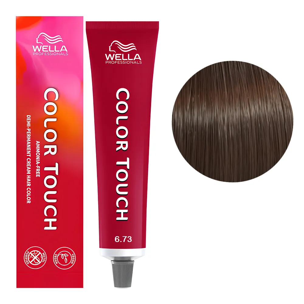Фарба без аміаку Color Touch - це новий рівень фарбування: багатовимірне тонування волосся. Веганський склад із вмістом до 85% інгредієнтів натурального походження, без аміаку (за винятком Color Touch Plus, що призначена для сивого волосся), робить фарбування максимально делікатним. Особливості продукту: 6/73 темний блондин коричнево-золотистий Фарба для тонування волосся без аміаку (Оновлена формула), 60 мл COLOR TOUCH Wella Professionals Усі відтінки базової гами Color Touch можна змішувати між собою. Застосування: 6/73 темний блондин коричнево-золотистий Фарба для тонування волосся без аміаку (Оновлена формула), 60 мл COLOR TOUCH Wella Professionals Час витримки: з теплом 15 хвилин, без тепла 20-25 хвилин. Продукт призначений для професійного використання. Уважно ознайомтесь з інструкцією.Тонувальна фарба без аміаку Color Touch Wella Professionals з оновленою веганською формулою
