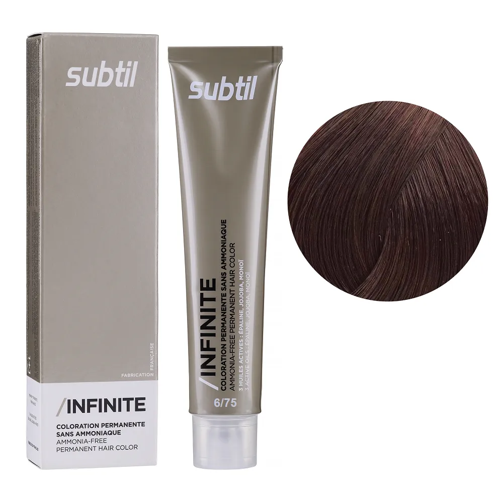 Subtil Infinite - фарба без вмісту аміаку нового покоління, що містить щонайменше 78% інгредієнтів природного походження та трилогію дорогоцінних олій: жожоба, моної, кукурудзяної. Забезпечує 100% зафарбовування сивини, супер блиск та супер стійкість. Безаміачна фарба додає волоссю стійкий і насичений колір, при цьому не ушкоджує і не висушує його. Олії, що входять до складу зволожують і ущільнюють волосся, роблять його блискучим і шовковистим. Щадна формула підходить навіть власницям чутливої шкіри голови. Так само фарба здатна освітлити волосся до трьох рівнів, що є революцією в світі безаміачних фарб. Розкішний колір, гладкість і здоровий блиск без шкоди для волосся. Застосування: 6/75 темний блондин коричнево-махагоновий Безаміачна стійка крем-фарба для волосся, 60 мл Permanent Hair Color INFINITE SUBTIL Крем-фарбу потрібно наносити на брудне сухе волосся. Фарбу слід змивати ретельно до повної прозорості води. Час витримки: 6/75 темний блондин коричнево-махагоновий Безаміачна стійка крем-фарба для волосся, 60 мл Permanent Hair Color INFINITE SUBTIL Витримати на волоссі від 30 до 35 хвилин, при наявності сивого волосся час впливу можна збільшити на 10 хвилин. Застосовувати фарбу слід, суворо дотримуючись інструкції, яка додається до кожної упаковки.Безаміачна стійка крем-фарба для волосся Permanent Hair Color INFINITE SUBTIL
