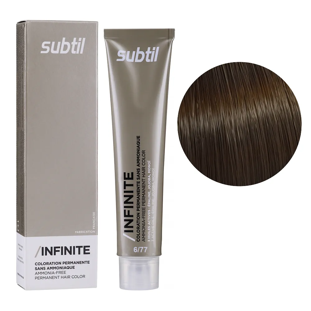 Subtil Infinite - фарба без вмісту аміаку нового покоління, що містить щонайменше 78% інгредієнтів природного походження та трилогію дорогоцінних олій: жожоба, моної, кукурудзяної. Забезпечує 100% зафарбовування сивини, супер блиск та супер стійкість. Безаміачна фарба додає волоссю стійкий і насичений колір, при цьому не ушкоджує і не висушує його. Олії, що входять до складу зволожують і ущільнюють волосся, роблять його блискучим і шовковистим. Щадна формула підходить навіть власницям чутливої шкіри голови. Так само фарба здатна освітлити волосся до трьох рівнів, що є революцією в світі безаміачних фарб. Розкішний колір, гладкість і здоровий блиск без шкоди для волосся. Застосування: 6/77 темний блондин інтенсивний коричневий Безаміачна стійка крем-фарба для волосся, 60 мл Permanent Hair Color INFINITE SUBTIL Крем-фарбу потрібно наносити на брудне сухе волосся. Фарбу слід змивати ретельно до повної прозорості води. Час витримки: 6/77 темний блондин інтенсивний коричневий Безаміачна стійка крем-фарба для волосся, 60 мл Permanent Hair Color INFINITE SUBTIL Витримати на волоссі від 30 до 35 хвилин, при наявності сивого волосся час впливу можна збільшити на 10 хвилин. Застосовувати фарбу слід, суворо дотримуючись інструкції, яка додається до кожної упаковки.Безаміачна стійка крем-фарба для волосся Permanent Hair Color INFINITE SUBTIL