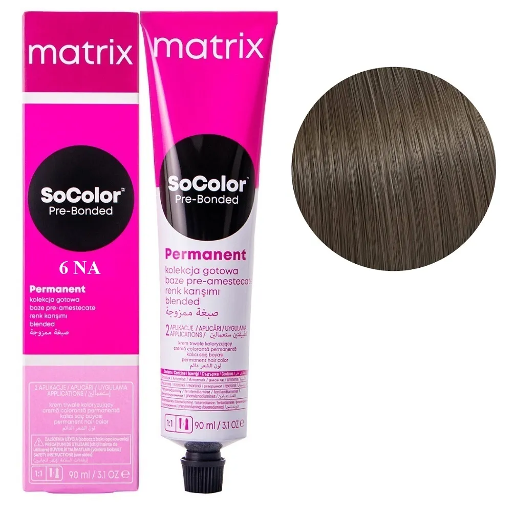 SoColor Pre-Bonded Cream Permanent- це оновлена версія легендарної фарби від бренду MATRIX, яка поєднує інтенсивний колір, тривалу стійкість та інноваційний догляд. Завдяки сучасній формулі з технологією Pre-Bonded фарба одночасно дарує насичений відтінок і зміцнює внутрішні зв’язки волосся, запобігаючи ламкості та пошкодженням у процесі фарбування. Особливості продукту: 6NA темний блондин натурально-попелястий Крем-фарба для волосся, 90 мл SoColor Pre-Bonded MATRIX (оновлений дизайн) SoColor Pre-Bonded містить компоненти, які відновлюють структуру волосини та зберігають природний рівень зволоження. Завдяки цьому після фарбування волосся виглядає м’яким, блискучим і доглянутим. Застосування: 6NA темний блондин натурально-попелястий Крем-фарба для волосся, 90 мл SoColor Pre-Bonded MATRIX (оновлений дизайн) Фарба SoColor Pre-Bonded MATRIX змішується з окисником Matrix Cream Developer у пропорції 1:1. Концентрація обирається в залежності від колористичної задачі. Суміш наноситься на сухе немите волосся. Час витримки: 35–45 хвилин залежно від базового кольору та бажаного результату. Після завершення процесу фарбування волосся ретельно промити водою до прозорості, нанести шампунь для фарбованого волосся та завершити догляд кондиціонером або маскою. Результат: Ви отримуєте стійкий, глибокий і блискучий колір, який зберігається тривалий час. Навіть після багаторазового миття голови відтінок виглядає свіжим, а волосся залишається еластичним і сильним. SoColor Pre-Bonded MATRIX - це вибір професіоналів, які прагнуть дарувати клієнтам ідеальний колір та дбати про здоров’я волосся під час фарбування.Крем-фарба для волосся SoColor Pre-Bonded Cream Permanent MATRIX