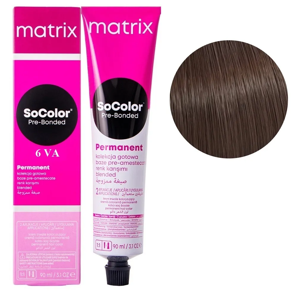 SoColor Pre-Bonded Cream Permanent- це оновлена версія легендарної фарби від бренду MATRIX, яка поєднує інтенсивний колір, тривалу стійкість та інноваційний догляд. Завдяки сучасній формулі з технологією Pre-Bonded фарба одночасно дарує насичений відтінок і зміцнює внутрішні зв’язки волосся, запобігаючи ламкості та пошкодженням у процесі фарбування. Особливості продукту: 6VA темний блондин фіолетовий попелястий Крем-фарба для волосся, 90 мл SoColor Pre-Bonded MATRIX (оновлений дизайн) SoColor Pre-Bonded містить компоненти, які відновлюють структуру волосини та зберігають природний рівень зволоження. Завдяки цьому після фарбування волосся виглядає м’яким, блискучим і доглянутим. Застосування: 6VA темний блондин фіолетовий попелястий Крем-фарба для волосся, 90 мл SoColor Pre-Bonded MATRIX (оновлений дизайн) Фарба SoColor Pre-Bonded MATRIX змішується з окисником Matrix Cream Developer у пропорції 1:1. Концентрація обирається в залежності від колористичної задачі. Суміш наноситься на сухе немите волосся. Час витримки: 35–45 хвилин залежно від базового кольору та бажаного результату. Після завершення процесу фарбування волосся ретельно промити водою до прозорості, нанести шампунь для фарбованого волосся та завершити догляд кондиціонером або маскою. Результат: Ви отримуєте стійкий, глибокий і блискучий колір, який зберігається тривалий час. Навіть після багаторазового миття голови відтінок виглядає свіжим, а волосся залишається еластичним і сильним. SoColor Pre-Bonded MATRIX - це вибір професіоналів, які прагнуть дарувати клієнтам ідеальний колір та дбати про здоров’я волосся під час фарбування.Крем-фарба для волосся SoColor Pre-Bonded Cream Permanent MATRIX