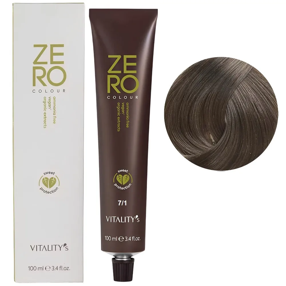 Zero Colour – це веганська фарба з високим натуральним індексом, зі зниженим ризиком подразнення та алергії. Завдяки антиоксидантним та пом`якшувальним властивостям, вона допомагає захистити колір та робить волосся м`яким і шовковистим. Формула без аміаку делікатно відновлює волосся для багатогранного, насиченого та сяючого кольору. Здатна задовольнити бажання кольору всіх жінок, навіть тих, хто має проблеми з чутливістю шкіри. Результат зберігається до 6 тижнів. Зменшуються подразнення та сухість шкіри голови, покращується загальний стан волосся після фарбування. Особливості продукту: 7/1 блондин попелястий Крем-фарба для волосся без аміаку, 100 мл ZERO VEGAN Vitality`s Застосування: 7/1 блондин попелястий Крем-фарба для волосся без аміаку, 100 мл ZERO VEGAN Vitality`s Важливо! Продукт для професійного застосування. Уважно ознайомтесь з інструкцією..Крем-фарба для волосся без аміаку ZERO VEGAN Vitality`s