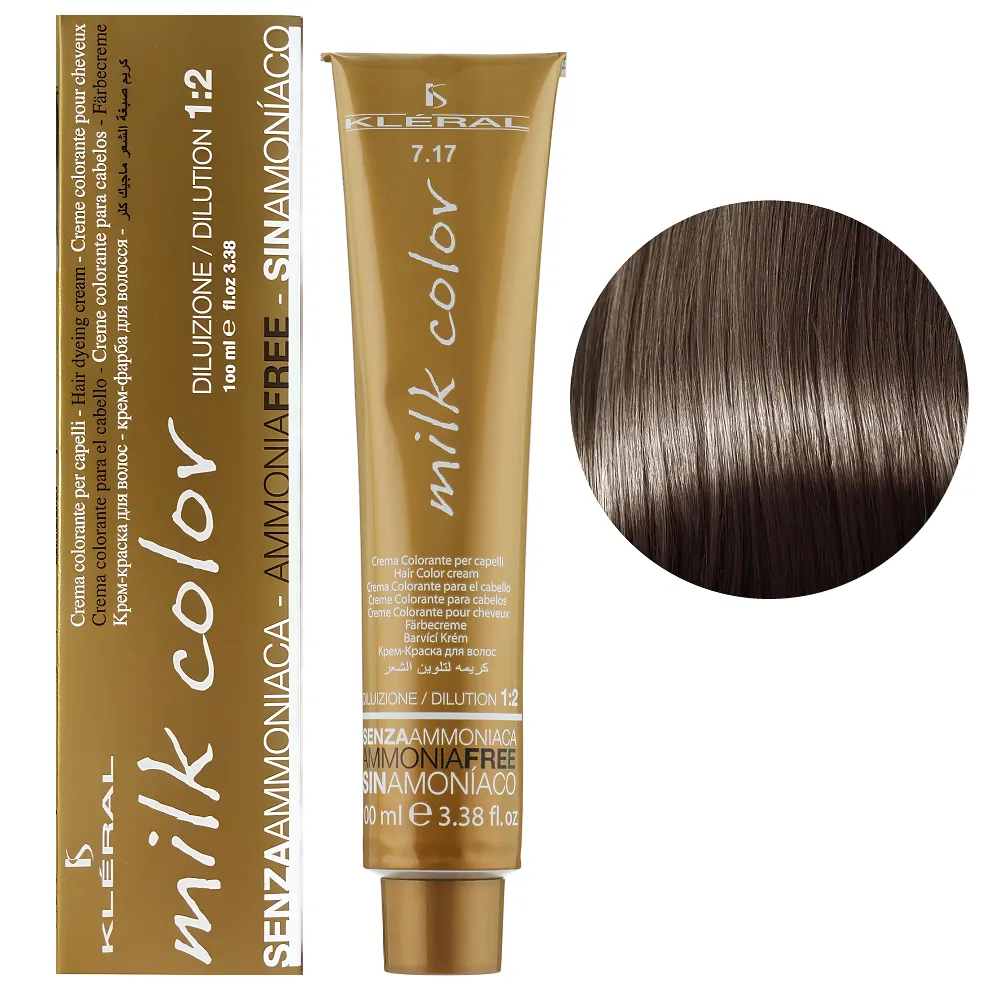 Безаміачна фарба Milk Color, розроблена італійською компанією Kleral System, представлена більше ніж 40 відтінками. Прекрасно забарвлює волосся, у тому числі і сиве (якщо сивини не більше 50%) у близькі до натуральних кольорів. Завдяки своєму щадному складу і компонентам, що доглядають, не пошкоджує структуру волосся, надає їм блиск і м`якість. Milk Color ідеально підходить для пошкодженого волосся. Тюбик містить 100 мл фарби та розрахований на 2 повні нанесення. Рекомендований окислювач - 20-vol стабілізований перекис водню. Для збільшення освітлювальної дії, використовуйте стабілізований перекис водню в 30- або 40-vol емульсії. Особливості продукту: 7/17 Teak блонд Крем-фарба для волосся перманентна без аміаку, 100 мл Milk Color KLERAL System Застосування: 7/17 Teak блонд Крем-фарба для волосся перманентна без аміаку, 100 мл Milk Color KLERAL System Продукт призначений для професійного використання. Уважно ознайомтесь з інструкцією.Крем-фарба для волосся перманентна без аміаку Milk Color KLERAL System