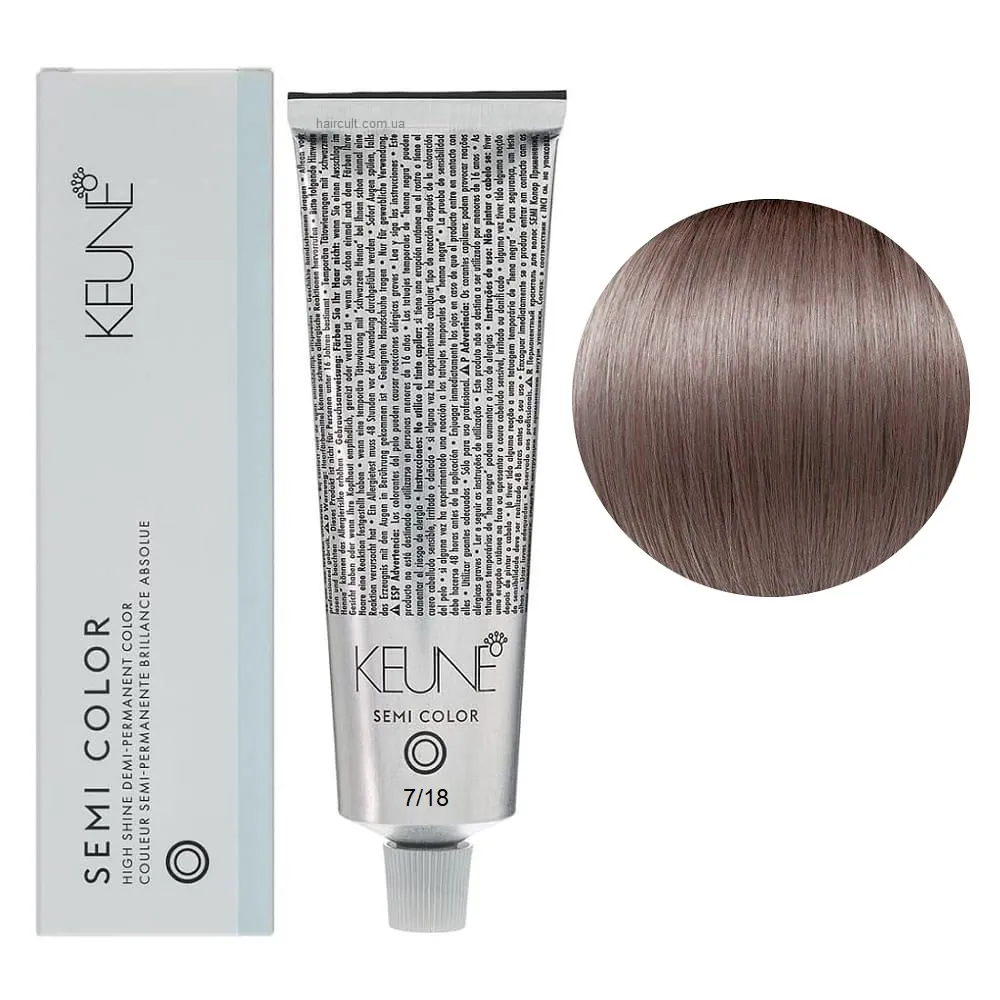 Keune Semi Color - це інноваційна безаміачна крем-фарба для волосся, створена на основі технології Silsoft, що забезпечує стійкий результат без шкоди для структури волосся. Засіб ідеально підходить для тонування, освіження кольору та фарбування до 70% сивини. Формула нового покоління містить активні компоненти, які м’яко відновлюють природний відтінок, роблять волосся гладким, м’яким і еластичним. Завдяки нейтральному pH та відсутності аміаку, фарба підходить навіть для чутливої шкіри голови та волосся після хімічних процедур. Особливості продукту: 7/18 Середній блондин попелясто-мока Фарба для тонування волосся без аміаку, 60 мл Demi-Permanent Color SЕМІ COLOR KEUNE Застосування: 7/18 Середній блондин попелясто-мока Фарба для тонування волосся без аміаку, 60 мл Demi-Permanent Color SЕМІ COLOR KEUNE Фарбу Keune Semi Color слід змішати з Activator Semi Color (2.25%) або Activator Intense Semi Color (3%) у співвідношенні 1:2. Час витримки 20 хвилин. Продукт для професійного використання. Уважно ознайомтесь з офіційною інструкцією.Фарба для тонування волосся без аміаку Demi-Permanent Color SЕМІ COLOR KEUNE