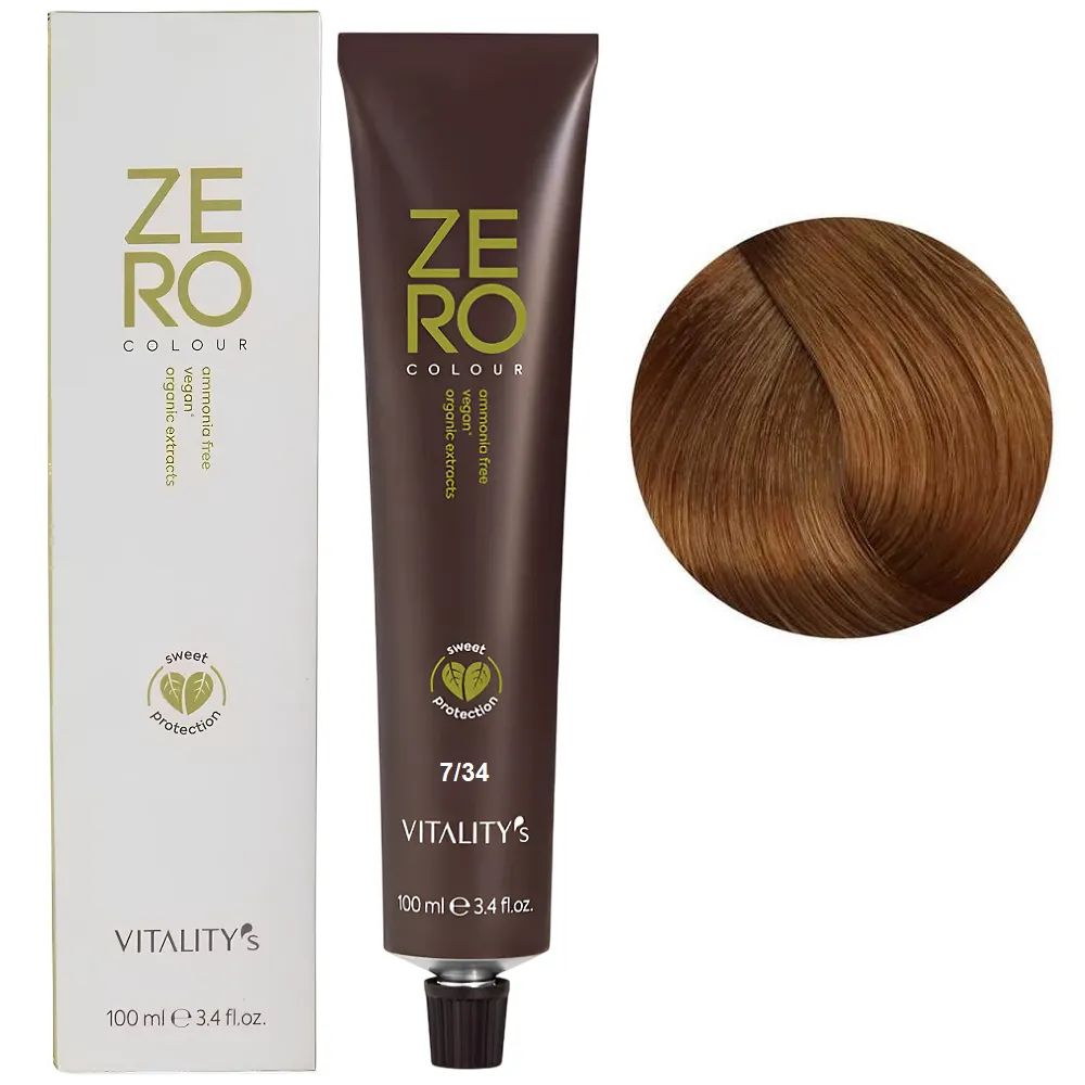 Zero Colour – це веганська фарба з високим натуральним індексом, зі зниженим ризиком подразнення та алергії. Завдяки антиоксидантним та пом`якшувальним властивостям, вона допомагає захистити колір та робить волосся м`яким і шовковистим. Формула без аміаку делікатно відновлює волосся для багатогранного, насиченого та сяючого кольору. Здатна задовольнити бажання кольору всіх жінок, навіть тих, хто має проблеми з чутливістю шкіри. Результат зберігається до 6 тижнів. Зменшуються подразнення та сухість шкіри голови, покращується загальний стан волосся після фарбування. Особливості продукту: 7/34 блондин золотисто-мідний Крем-фарба для волосся без аміаку, 100 мл ZERO VEGAN Vitality`s Застосування: 7/34 блондин золотисто-мідний Крем-фарба для волосся без аміаку, 100 мл ZERO VEGAN Vitality`s Важливо! Продукт для професійного застосування. Уважно ознайомтесь з інструкцією..Крем-фарба для волосся без аміаку ZERO VEGAN Vitality`s