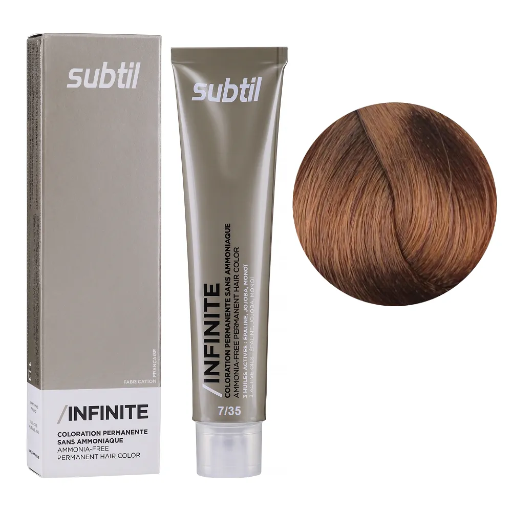 Subtil Infinite - фарба без вмісту аміаку нового покоління, що містить щонайменше 78% інгредієнтів природного походження та трилогію дорогоцінних олій: жожоба, моної, кукурудзяної. Забезпечує 100% зафарбовування сивини, супер блиск та супер стійкість. Безаміачна фарба додає волоссю стійкий і насичений колір, при цьому не ушкоджує і не висушує його. Олії, що входять до складу зволожують і ущільнюють волосся, роблять його блискучим і шовковистим. Щадна формула підходить навіть власницям чутливої шкіри голови. Так само фарба здатна освітлити волосся до трьох рівнів, що є революцією в світі безаміачних фарб. Розкішний колір, гладкість і здоровий блиск без шкоди для волосся. Застосування: 7/35 блондин золотистий червоне дерево Безаміачна стійка крем-фарба для волосся, 60 мл Permanent Hair Color INFINITE SUBTIL Крем-фарбу потрібно наносити на брудне сухе волосся. Фарбу слід змивати ретельно до повної прозорості води. Час витримки: 7/35 блондин золотистий червоне дерево Безаміачна стійка крем-фарба для волосся, 60 мл Permanent Hair Color INFINITE SUBTIL Витримати на волоссі від 30 до 35 хвилин, при наявності сивого волосся час впливу можна збільшити на 10 хвилин. Застосовувати фарбу слід, суворо дотримуючись інструкції, яка додається до кожної упаковки.Безаміачна стійка крем-фарба для волосся Permanent Hair Color INFINITE SUBTIL