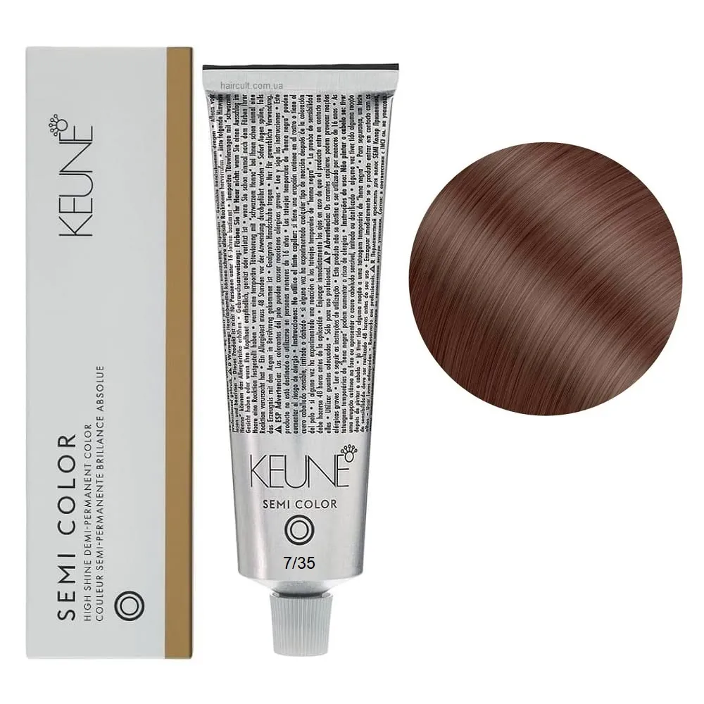 Keune Semi Color - це інноваційна безаміачна крем-фарба для волосся, створена на основі технології Silsoft, що забезпечує стійкий результат без шкоди для структури волосся. Засіб ідеально підходить для тонування, освіження кольору та фарбування до 70% сивини. Формула нового покоління містить активні компоненти, які м’яко відновлюють природний відтінок, роблять волосся гладким, м’яким і еластичним. Завдяки нейтральному pH та відсутності аміаку, фарба підходить навіть для чутливої шкіри голови та волосся після хімічних процедур. Особливості продукту: 7/35 Середній блондин золотисто-махагоновий Фарба для тонування волосся без аміаку, 60 мл Demi-Permanent Color SЕМІ COLOR KEUNE Застосування: 7/35 Середній блондин золотисто-махагоновий Фарба для тонування волосся без аміаку, 60 мл Demi-Permanent Color SЕМІ COLOR KEUNE Фарбу Keune Semi Color слід змішати з Activator Semi Color (2.25%) або Activator Intense Semi Color (3%) у співвідношенні 1:2. Час витримки 20 хвилин. Продукт для професійного використання. Уважно ознайомтесь з офіційною інструкцією.Фарба для тонування волосся без аміаку Demi-Permanent Color SЕМІ COLOR KEUNE