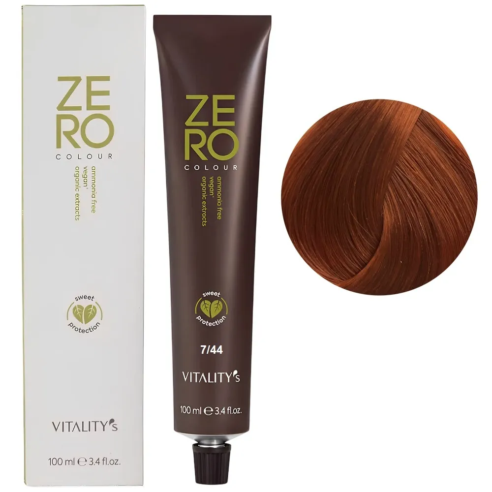 Zero Colour – це веганська фарба з високим натуральним індексом, зі зниженим ризиком подразнення та алергії. Завдяки антиоксидантним та пом`якшувальним властивостям, вона допомагає захистити колір та робить волосся м`яким і шовковистим. Формула без аміаку делікатно відновлює волосся для багатогранного, насиченого та сяючого кольору. Здатна задовольнити бажання кольору всіх жінок, навіть тих, хто має проблеми з чутливістю шкіри. Результат зберігається до 6 тижнів. Зменшуються подразнення та сухість шкіри голови, покращується загальний стан волосся після фарбування. Особливості продукту: 7/44 блондин мідний інтенсивний Крем-фарба для волосся без аміаку, 100 мл ZERO VEGAN Vitality`s Застосування: 7/44 блондин мідний інтенсивний Крем-фарба для волосся без аміаку, 100 мл ZERO VEGAN Vitality`s Важливо! Продукт для професійного застосування. Уважно ознайомтесь з інструкцією..Крем-фарба для волосся без аміаку ZERO VEGAN Vitality`s