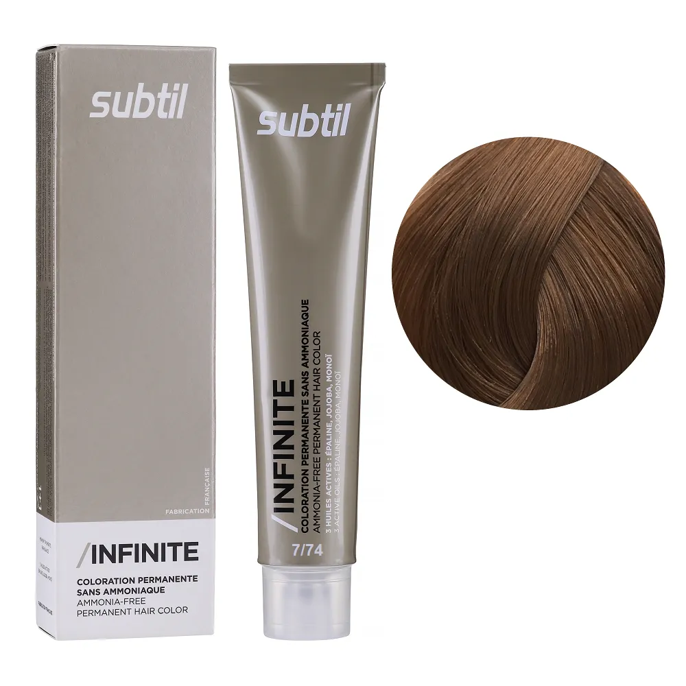 Subtil Infinite - фарба без вмісту аміаку нового покоління, що містить щонайменше 78% інгредієнтів природного походження та трилогію дорогоцінних олій: жожоба, моної, кукурудзяної. Забезпечує 100% зафарбовування сивини, супер блиск та супер стійкість. Безаміачна фарба додає волоссю стійкий і насичений колір, при цьому не ушкоджує і не висушує його. Олії, що входять до складу зволожують і ущільнюють волосся, роблять його блискучим і шовковистим. Щадна формула підходить навіть власницям чутливої шкіри голови. Так само фарба здатна освітлити волосся до трьох рівнів, що є революцією в світі безаміачних фарб. Розкішний колір, гладкість і здоровий блиск без шкоди для волосся. Застосування: 7/74 блондин коричнево-мідний Безаміачна стійка крем-фарба для волосся, 60 мл Permanent Hair Color INFINITE SUBTIL Крем-фарбу потрібно наносити на брудне сухе волосся. Фарбу слід змивати ретельно до повної прозорості води. Час витримки: 7/74 блондин коричнево-мідний Безаміачна стійка крем-фарба для волосся, 60 мл Permanent Hair Color INFINITE SUBTIL Витримати на волоссі від 30 до 35 хвилин, при наявності сивого волосся час впливу можна збільшити на 10 хвилин. Застосовувати фарбу слід, суворо дотримуючись інструкції, яка додається до кожної упаковки.Безаміачна стійка крем-фарба для волосся Permanent Hair Color INFINITE SUBTIL