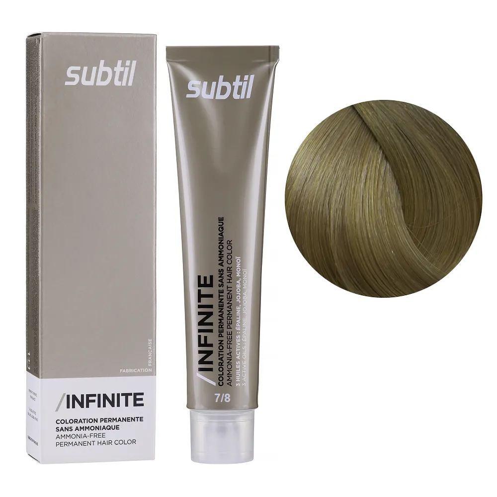 Subtil Infinite - фарба без вмісту аміаку нового покоління, що містить щонайменше 78% інгредієнтів природного походження та трилогію дорогоцінних олій: жожоба, моної, кукурудзяної. Забезпечує 100% зафарбовування сивини, супер блиск та супер стійкість. Безаміачна фарба додає волоссю стійкий і насичений колір, при цьому не ушкоджує і не висушує його. Олії, що входять до складу зволожують і ущільнюють волосся, роблять його блискучим і шовковистим. Щадна формула підходить навіть власницям чутливої шкіри голови. Так само фарба здатна освітлити волосся до трьох рівнів, що є революцією в світі безаміачних фарб. Розкішний колір, гладкість і здоровий блиск без шкоди для волосся. Застосування: 7/8 блондин бежевий Безаміачна стійка крем-фарба для волосся, 60 мл Permanent Hair Color INFINITE SUBTIL Крем-фарбу потрібно наносити на брудне сухе волосся. Фарбу слід змивати ретельно до повної прозорості води. Час витримки: 7/8 блондин бежевий Безаміачна стійка крем-фарба для волосся, 60 мл Permanent Hair Color INFINITE SUBTIL Витримати на волоссі від 30 до 35 хвилин, при наявності сивого волосся час впливу можна збільшити на 10 хвилин. Застосовувати фарбу слід, суворо дотримуючись інструкції, яка додається до кожної упаковки.Безаміачна стійка крем-фарба для волосся Permanent Hair Color INFINITE SUBTIL