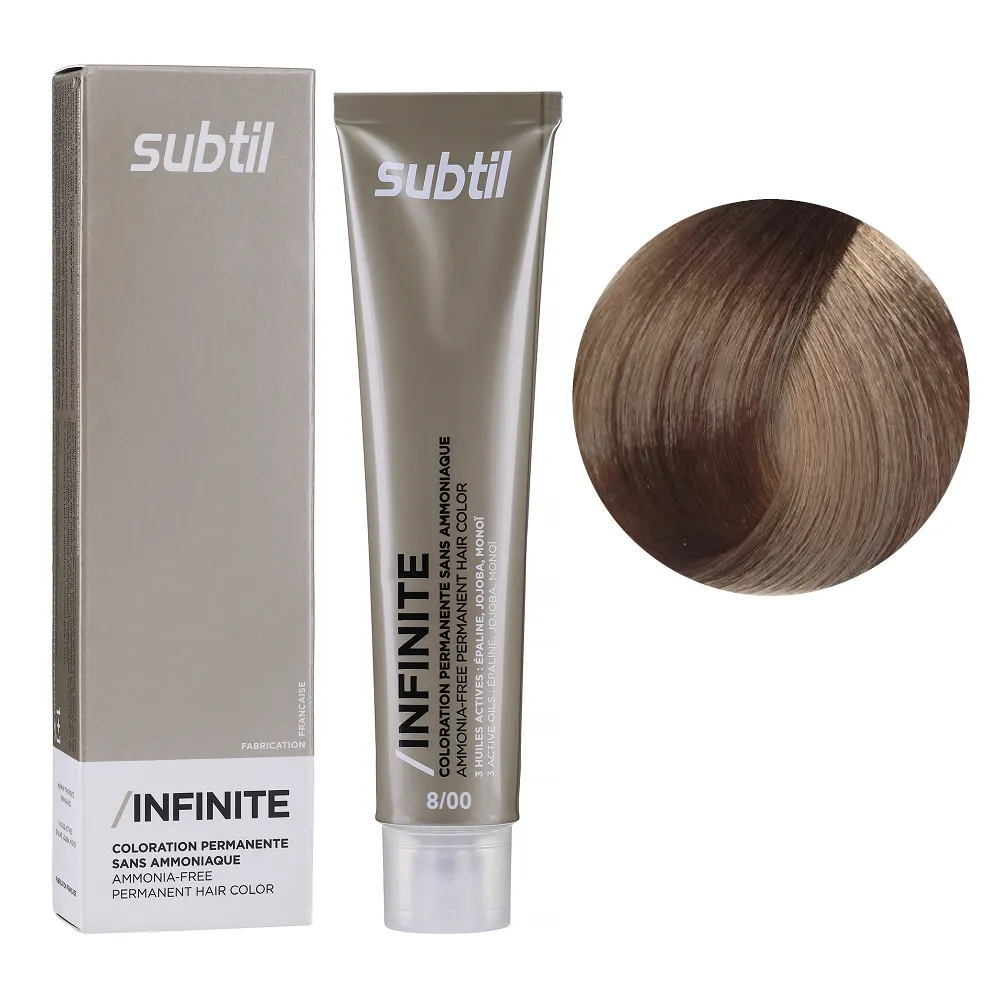 Subtil Infinite - фарба без вмісту аміаку нового покоління, що містить щонайменше 78% інгредієнтів природного походження та трилогію дорогоцінних олій: жожоба, моної, кукурудзяної. Забезпечує 100% зафарбовування сивини, супер блиск та супер стійкість. Безаміачна фарба додає волоссю стійкий і насичений колір, при цьому не ушкоджує і не висушує його. Олії, що входять до складу зволожують і ущільнюють волосся, роблять його блискучим і шовковистим. Щадна формула підходить навіть власницям чутливої шкіри голови. Так само фарба здатна освітлити волосся до трьох рівнів, що є революцією в світі безаміачних фарб. Розкішний колір, гладкість і здоровий блиск без шкоди для волосся. Застосування: 8/00 світлий блондин інтенсивний Безаміачна стійка крем-фарба для волосся, 60 мл Permanent Hair Color INFINITE SUBTIL Крем-фарбу потрібно наносити на брудне сухе волосся. Фарбу слід змивати ретельно до повної прозорості води. Час витримки: 8/00 світлий блондин інтенсивний Безаміачна стійка крем-фарба для волосся, 60 мл Permanent Hair Color INFINITE SUBTIL Витримати на волоссі від 30 до 35 хвилин, при наявності сивого волосся час впливу можна збільшити на 10 хвилин. Застосовувати фарбу слід, суворо дотримуючись інструкції, яка додається до кожної упаковки.Безаміачна крем-фарба для волосся Permanent Hair Color INFINITE SUBTIL