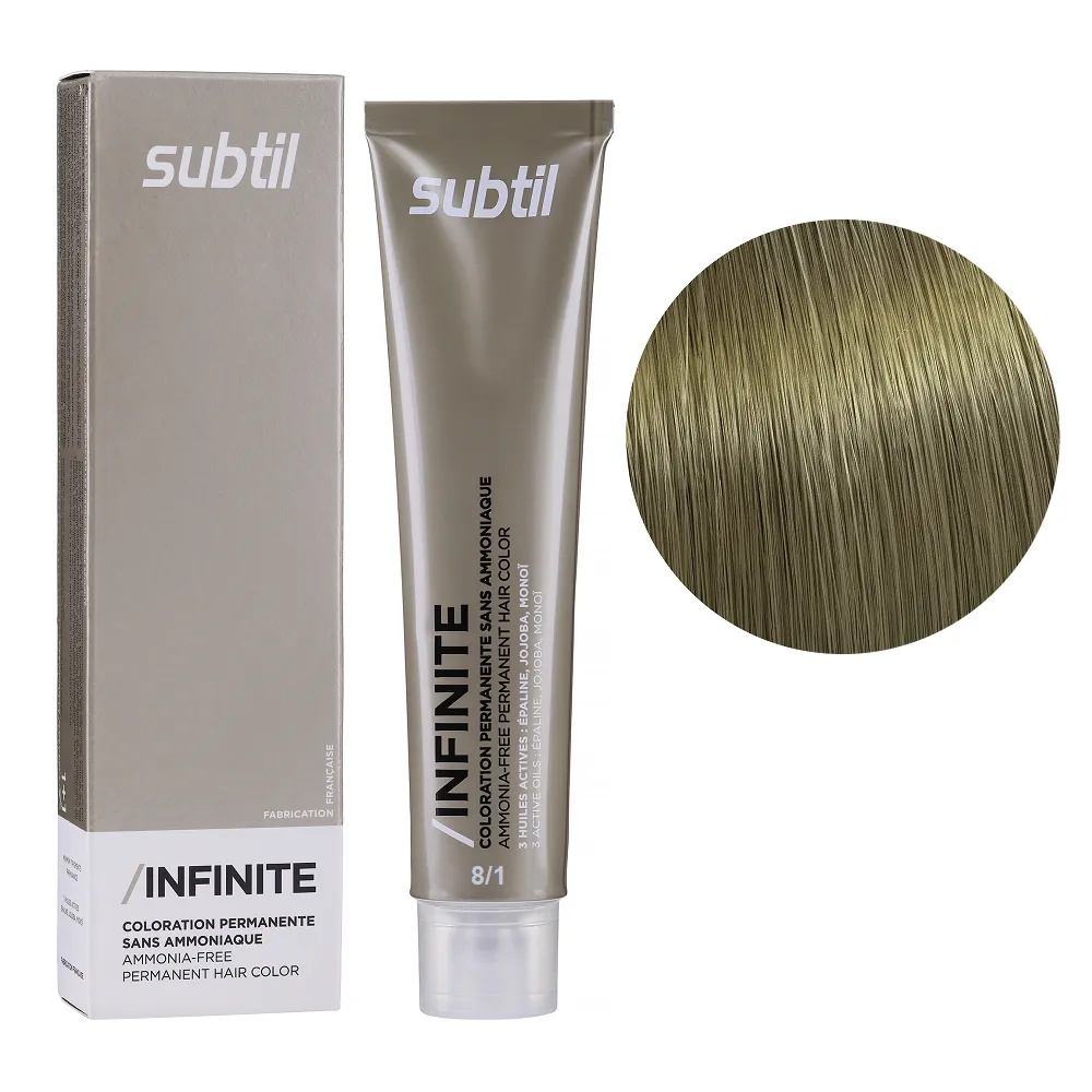 Subtil Infinite - фарба без вмісту аміаку нового покоління, що містить щонайменше 78% інгредієнтів природного походження та трилогію дорогоцінних олій: жожоба, моної, кукурудзяної. Забезпечує 100% зафарбовування сивини, супер блиск та супер стійкість. Безаміачна фарба додає волоссю стійкий і насичений колір, при цьому не ушкоджує і не висушує його. Олії, що входять до складу зволожують і ущільнюють волосся, роблять його блискучим і шовковистим. Щадна формула підходить навіть власницям чутливої шкіри голови. Так само фарба здатна освітлити волосся до трьох рівнів, що є революцією в світі безаміачних фарб. Розкішний колір, гладкість і здоровий блиск без шкоди для волосся. Застосування: 8/1 світлий блондин попелястий Безаміачна стійка крем-фарба для волосся, 60 мл Permanent Hair Color INFINITE SUBTIL Крем-фарбу потрібно наносити на брудне сухе волосся. Фарбу слід змивати ретельно до повної прозорості води. Час витримки: 8/1 світлий блондин попелястий Безаміачна стійка крем-фарба для волосся, 60 мл Permanent Hair Color INFINITE SUBTIL Витримати на волоссі від 30 до 35 хвилин, при наявності сивого волосся час впливу можна збільшити на 10 хвилин. Застосовувати фарбу слід, суворо дотримуючись інструкції, яка додається до кожної упаковки.Безаміачна стійка крем-фарба для волосся Permanent Hair Color INFINITE SUBTIL