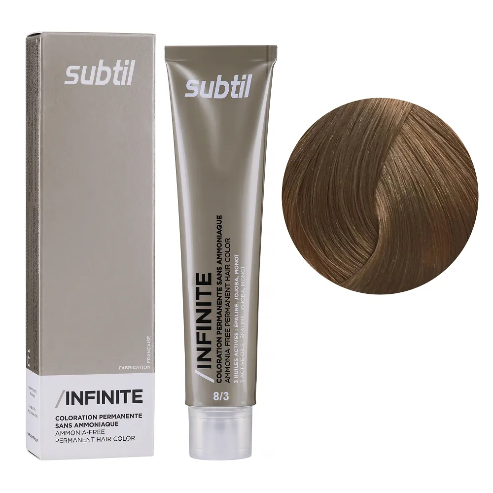 Subtil Infinite - фарба без вмісту аміаку нового покоління, що містить щонайменше 78% інгредієнтів природного походження та трилогію дорогоцінних олій: жожоба, моної, кукурудзяної. Забезпечує 100% зафарбовування сивини, супер блиск та супер стійкість. Безаміачна фарба додає волоссю стійкий і насичений колір, при цьому не ушкоджує і не висушує його. Олії, що входять до складу зволожують і ущільнюють волосся, роблять його блискучим і шовковистим. Щадна формула підходить навіть власницям чутливої шкіри голови. Так само фарба здатна освітлити волосся до трьох рівнів, що є революцією в світі безаміачних фарб. Розкішний колір, гладкість і здоровий блиск без шкоди для волосся. Застосування: 8/3 світло блондин золотистий Безаміачна стійка крем-фарба для волосся, 60 мл Permanent Hair Color INFINITE SUBTIL Крем-фарбу потрібно наносити на брудне сухе волосся. Фарбу слід змивати ретельно до повної прозорості води. Час витримки: 8/3 світло блондин золотистий Безаміачна стійка крем-фарба для волосся, 60 мл Permanent Hair Color INFINITE SUBTIL Витримати на волоссі від 30 до 35 хвилин, при наявності сивого волосся час впливу можна збільшити на 10 хвилин. Застосовувати фарбу слід, суворо дотримуючись інструкції, яка додається до кожної упаковки.Безаміачна стійка крем-фарба для волосся Permanent Hair Color INFINITE SUBTIL