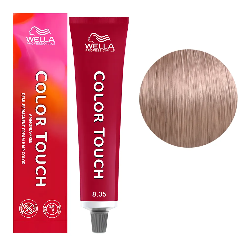 Фарба без аміаку Color Touch - це новий рівень фарбування: багатовимірне тонування волосся. Веганський склад із вмістом до 85% інгредієнтів натурального походження, без аміаку (за винятком Color Touch Plus, що призначена для сивого волосся), робить фарбування максимально делікатним. Особливості продукту: 8/35 світлий блондин золотисто-рожевий Фарба для тонування волосся без аміаку (Оновлена формула), 60 мл COLOR TOUCH Wella Professionals Усі відтінки базової гами Color Touch можна змішувати між собою. Застосування: 8/35 світлий блондин золотисто-рожевий Фарба для тонування волосся без аміаку (Оновлена формула), 60 мл COLOR TOUCH Wella Professionals Час витримки: з теплом 15 хвилин, без тепла 20-25 хвилин. Продукт призначений для професійного використання. Уважно ознайомтесь з інструкцією.Тонувальна фарба без аміаку Color Touch Wella Professionals з оновленою веганською формулою