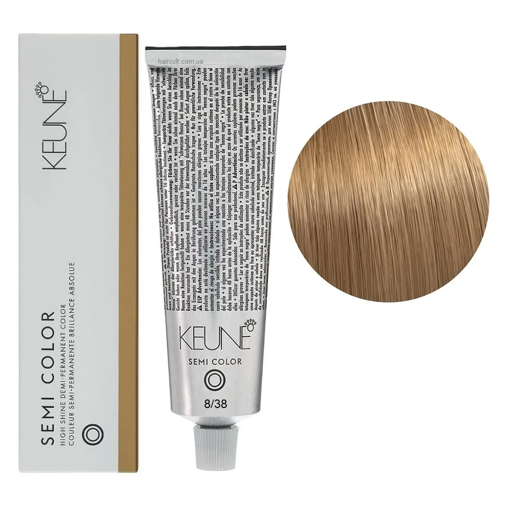 Keune Semi Color - це інноваційна безаміачна крем-фарба для волосся, створена на основі технології Silsoft, що забезпечує стійкий результат без шкоди для структури волосся. Засіб ідеально підходить для тонування, освіження кольору та фарбування до 70% сивини. Формула нового покоління містить активні компоненти, які м’яко відновлюють природний відтінок, роблять волосся гладким, м’яким і еластичним. Завдяки нейтральному pH та відсутності аміаку, фарба підходить навіть для чутливої шкіри голови та волосся після хімічних процедур. Особливості продукту: 8/38 Світлий блондин золотисто-мока Фарба для тонування волосся без аміаку, 60 мл Demi-Permanent Color SЕМІ COLOR KEUNE Застосування: 8/38 Світлий блондин золотисто-мока Фарба для тонування волосся без аміаку, 60 мл Demi-Permanent Color SЕМІ COLOR KEUNE Фарбу Keune Semi Color слід змішати з Activator Semi Color (2.25%) або Activator Intense Semi Color (3%) у співвідношенні 1:2. Час витримки 20 хвилин. Продукт для професійного використання. Уважно ознайомтесь з офіційною інструкцією.Фарба для тонування волосся без аміаку Demi-Permanent Color SЕМІ COLOR KEUNE