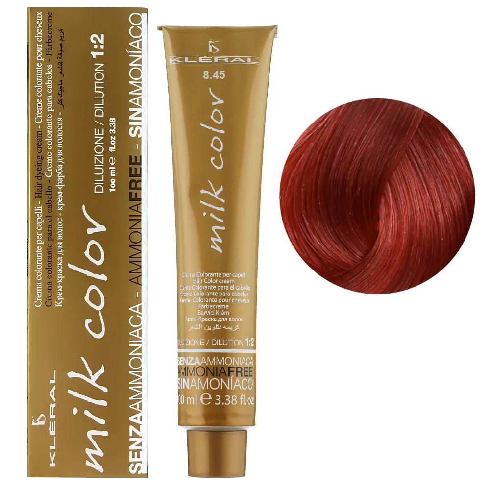 Безаміачна фарба Milk Color, розроблена італійською компанією Kleral System, представлена більше ніж 40 відтінками. Прекрасно забарвлює волосся, у тому числі і сиве (якщо сивини не більше 50%) у близькі до натуральних кольорів. Завдяки своєму щадному складу і компонентам, що доглядають, не пошкоджує структуру волосся, надає їм блиск і м`якість. Milk Color ідеально підходить для пошкодженого волосся. Тюбик містить 100 мл фарби та розрахований на 2 повні нанесення. Рекомендований окислювач - 20-vol стабілізований перекис водню. Для збільшення освітлювальної дії, використовуйте стабілізований перекис водню в 30- або 40-vol емульсії. Особливості продукту: 8/45 Світло-русявий мідний червоне дерево Крем-фарба для волосся перманентна без аміаку, 100 мл Milk Color KLERAL System Застосування: 8/45 Світло-русявий мідний червоне дерево Крем-фарба для волосся перманентна без аміаку, 100 мл Milk Color KLERAL System Продукт призначений для професійного використання. Уважно ознайомтесь з інструкцією.Крем-фарба для волосся перманентна без аміаку Milk Color KLERAL System