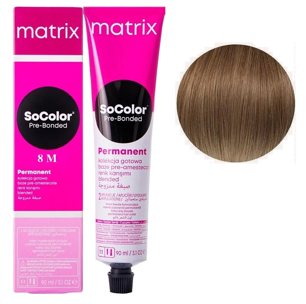 SoColor Pre-Bonded Cream Permanent- це оновлена версія легендарної фарби від бренду MATRIX, яка поєднує інтенсивний колір, тривалу стійкість та інноваційний догляд. Завдяки сучасній формулі з технологією Pre-Bonded фарба одночасно дарує насичений відтінок і зміцнює внутрішні зв’язки волосся, запобігаючи ламкості та пошкодженням у процесі фарбування. Особливості продукту: 8M світлий блондин мокка Крем-фарба для волосся, 90 мл SoColor Pre-Bonded MATRIX (оновлений дизайн) SoColor Pre-Bonded містить компоненти, які відновлюють структуру волосини та зберігають природний рівень зволоження. Завдяки цьому після фарбування волосся виглядає м’яким, блискучим і доглянутим. Застосування: 8M світлий блондин мокка Крем-фарба для волосся, 90 мл SoColor Pre-Bonded MATRIX (оновлений дизайн) Фарба SoColor Pre-Bonded MATRIX змішується з окисником Matrix Cream Developer у пропорції 1:1. Концентрація обирається в залежності від колористичної задачі. Суміш наноситься на сухе немите волосся. Час витримки: 35–45 хвилин залежно від базового кольору та бажаного результату. Після завершення процесу фарбування волосся ретельно промити водою до прозорості, нанести шампунь для фарбованого волосся та завершити догляд кондиціонером або маскою. Результат: Ви отримуєте стійкий, глибокий і блискучий колір, який зберігається тривалий час. Навіть після багаторазового миття голови відтінок виглядає свіжим, а волосся залишається еластичним і сильним. SoColor Pre-Bonded MATRIX - це вибір професіоналів, які прагнуть дарувати клієнтам ідеальний колір та дбати про здоров’я волосся під час фарбування.Крем-фарба для волосся SoColor Pre-Bonded Cream Permanent MATRIX