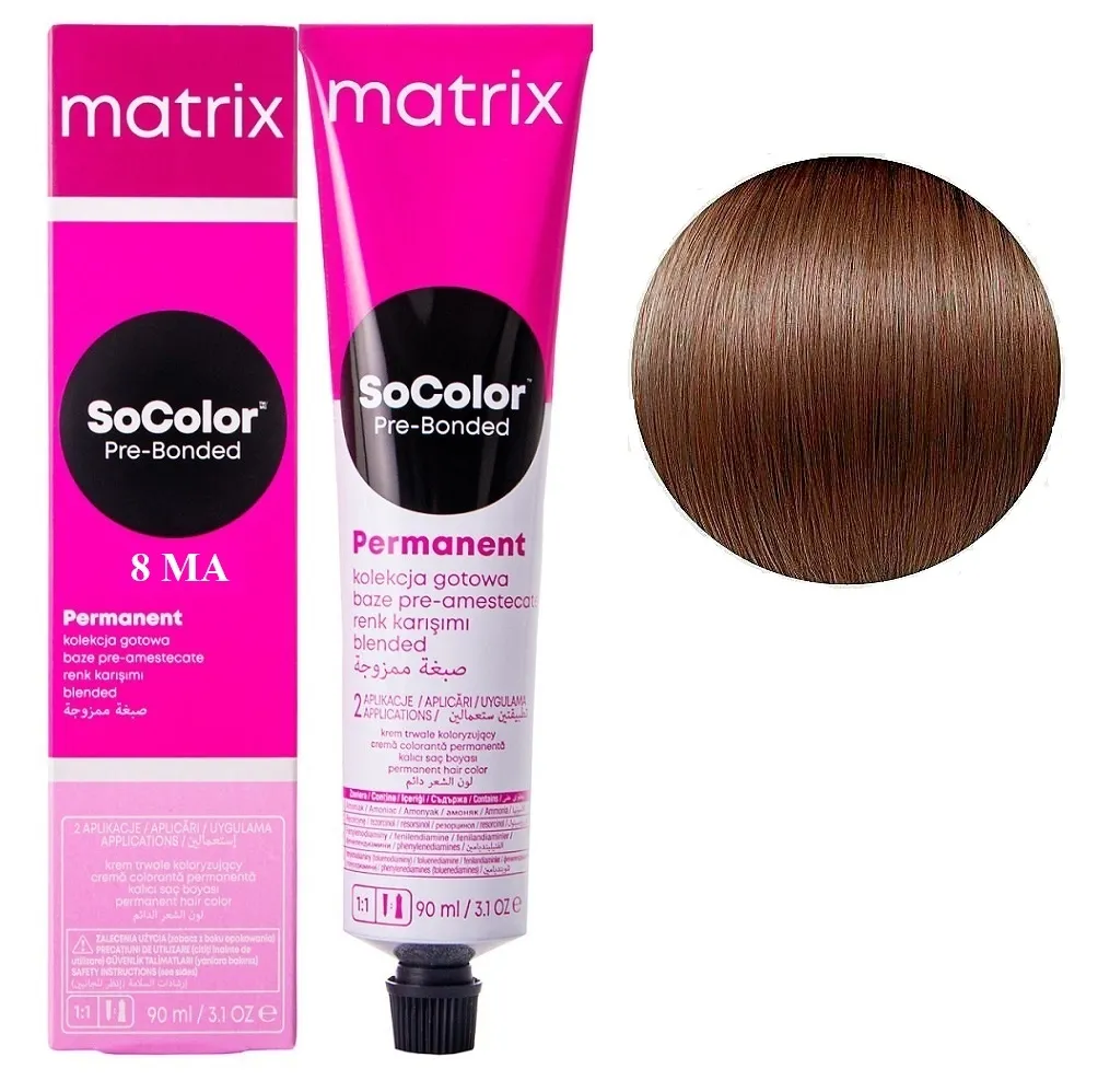 SoColor Pre-Bonded Cream Permanent- це оновлена версія легендарної фарби від бренду MATRIX, яка поєднує інтенсивний колір, тривалу стійкість та інноваційний догляд. Завдяки сучасній формулі з технологією Pre-Bonded фарба одночасно дарує насичений відтінок і зміцнює внутрішні зв’язки волосся, запобігаючи ламкості та пошкодженням у процесі фарбування. Особливості продукту: 8MA світлий блондин мокка попелястий Крем-фарба для волосся, 90 мл SoColor Pre-Bonded MATRIX (оновлений дизайн) SoColor Pre-Bonded містить компоненти, які відновлюють структуру волосини та зберігають природний рівень зволоження. Завдяки цьому після фарбування волосся виглядає м’яким, блискучим і доглянутим. Застосування: 8MA світлий блондин мокка попелястий Крем-фарба для волосся, 90 мл SoColor Pre-Bonded MATRIX (оновлений дизайн) Фарба SoColor Pre-Bonded MATRIX змішується з окисником Matrix Cream Developer у пропорції 1:1. Концентрація обирається в залежності від колористичної задачі. Суміш наноситься на сухе немите волосся. Час витримки: 35–45 хвилин залежно від базового кольору та бажаного результату. Після завершення процесу фарбування волосся ретельно промити водою до прозорості, нанести шампунь для фарбованого волосся та завершити догляд кондиціонером або маскою. Результат: Ви отримуєте стійкий, глибокий і блискучий колір, який зберігається тривалий час. Навіть після багаторазового миття голови відтінок виглядає свіжим, а волосся залишається еластичним і сильним. SoColor Pre-Bonded MATRIX - це вибір професіоналів, які прагнуть дарувати клієнтам ідеальний колір та дбати про здоров’я волосся під час фарбування.Крем-фарба для волосся SoColor Pre-Bonded Cream Permanent MATRIX