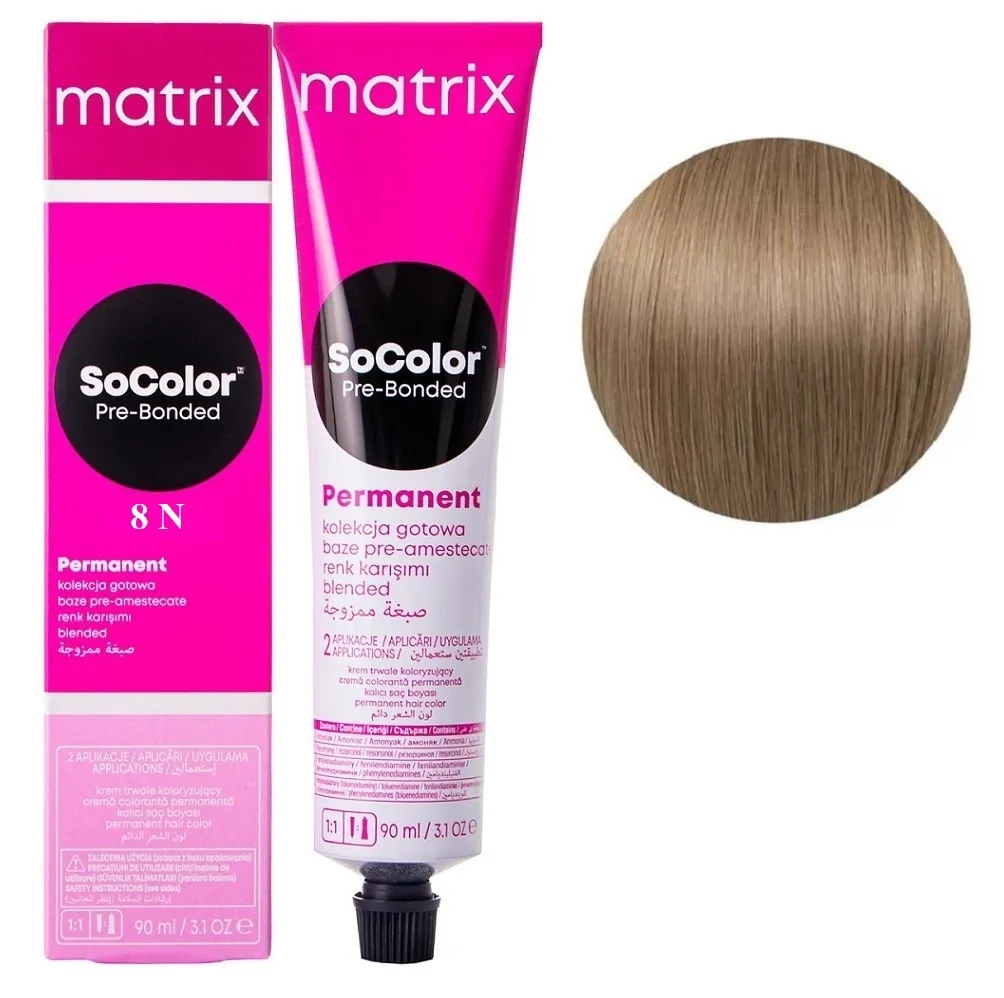 SoColor Pre-Bonded Cream Permanent- це оновлена версія легендарної фарби від бренду MATRIX, яка поєднує інтенсивний колір, тривалу стійкість та інноваційний догляд. Завдяки сучасній формулі з технологією Pre-Bonded фарба одночасно дарує насичений відтінок і зміцнює внутрішні зв’язки волосся, запобігаючи ламкості та пошкодженням у процесі фарбування. Особливості продукту: 8N світлий блондин натуральний Крем-фарба для волосся, 90 мл SoColor Pre-Bonded MATRIX (оновлений дизайн) SoColor Pre-Bonded містить компоненти, які відновлюють структуру волосини та зберігають природний рівень зволоження. Завдяки цьому після фарбування волосся виглядає м’яким, блискучим і доглянутим. Застосування: 8N світлий блондин натуральний Крем-фарба для волосся, 90 мл SoColor Pre-Bonded MATRIX (оновлений дизайн) Фарба SoColor Pre-Bonded MATRIX змішується з окисником Matrix Cream Developer у пропорції 1:1. Концентрація обирається в залежності від колористичної задачі. Суміш наноситься на сухе немите волосся. Час витримки: 35–45 хвилин залежно від базового кольору та бажаного результату. Після завершення процесу фарбування волосся ретельно промити водою до прозорості, нанести шампунь для фарбованого волосся та завершити догляд кондиціонером або маскою. Результат: Ви отримуєте стійкий, глибокий і блискучий колір, який зберігається тривалий час. Навіть після багаторазового миття голови відтінок виглядає свіжим, а волосся залишається еластичним і сильним. SoColor Pre-Bonded MATRIX - це вибір професіоналів, які прагнуть дарувати клієнтам ідеальний колір та дбати про здоров’я волосся під час фарбування.Крем-фарба для волосся SoColor Pre-Bonded Cream Permanent MATRIX
