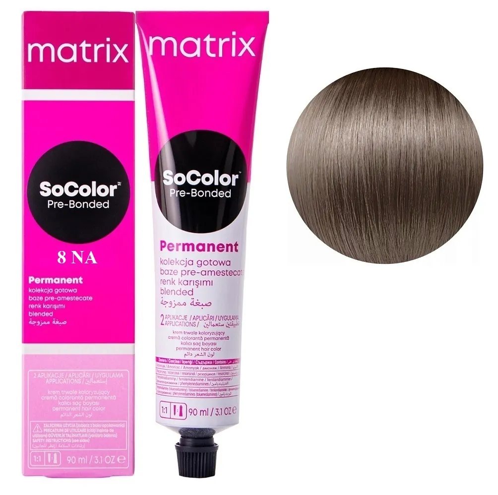 SoColor Pre-Bonded Cream Permanent- це оновлена версія легендарної фарби від бренду MATRIX, яка поєднує інтенсивний колір, тривалу стійкість та інноваційний догляд. Завдяки сучасній формулі з технологією Pre-Bonded фарба одночасно дарує насичений відтінок і зміцнює внутрішні зв’язки волосся, запобігаючи ламкості та пошкодженням у процесі фарбування. Особливості продукту: 8NA світлий блондин натуральний попелястий Крем-фарба для волосся, 90 мл SoColor Pre-Bonded MATRIX (оновлений дизайн) SoColor Pre-Bonded містить компоненти, які відновлюють структуру волосини та зберігають природний рівень зволоження. Завдяки цьому після фарбування волосся виглядає м’яким, блискучим і доглянутим. Застосування: 8NA світлий блондин натуральний попелястий Крем-фарба для волосся, 90 мл SoColor Pre-Bonded MATRIX (оновлений дизайн) Фарба SoColor Pre-Bonded MATRIX змішується з окисником Matrix Cream Developer у пропорції 1:1. Концентрація обирається в залежності від колористичної задачі. Суміш наноситься на сухе немите волосся. Час витримки: 35–45 хвилин залежно від базового кольору та бажаного результату. Після завершення процесу фарбування волосся ретельно промити водою до прозорості, нанести шампунь для фарбованого волосся та завершити догляд кондиціонером або маскою. Результат: Ви отримуєте стійкий, глибокий і блискучий колір, який зберігається тривалий час. Навіть після багаторазового миття голови відтінок виглядає свіжим, а волосся залишається еластичним і сильним. SoColor Pre-Bonded MATRIX - це вибір професіоналів, які прагнуть дарувати клієнтам ідеальний колір та дбати про здоров’я волосся під час фарбування.Крем-фарба для волосся SoColor Pre-Bonded Cream Permanent MATRIX