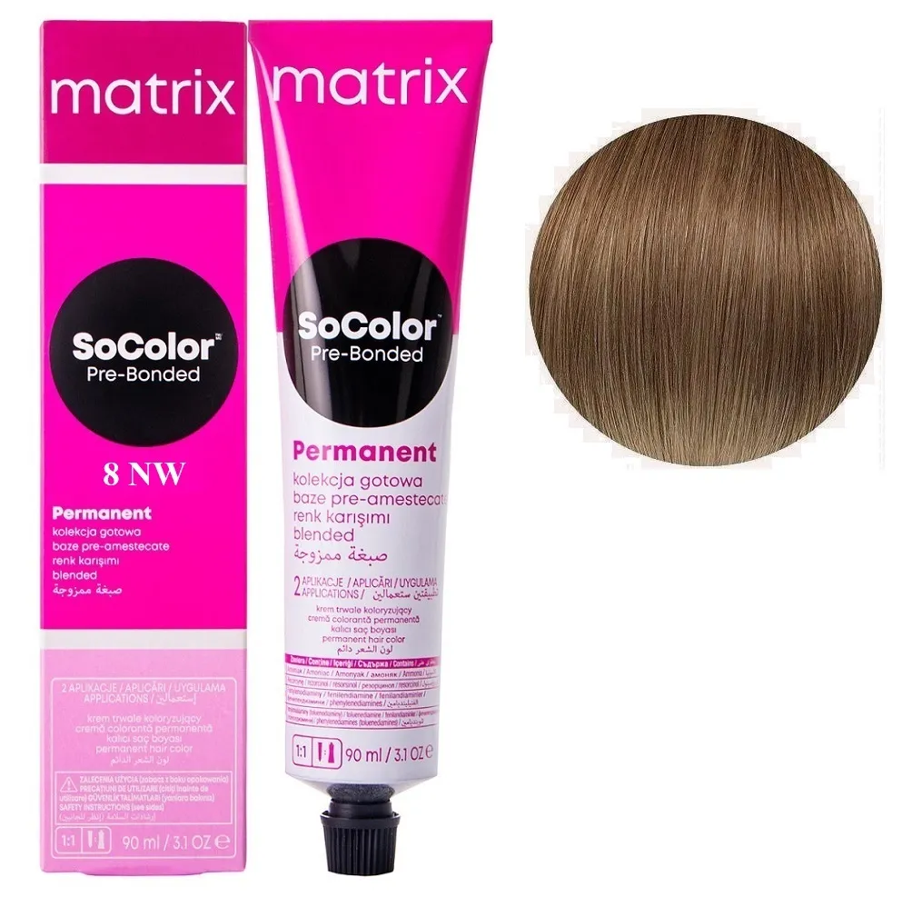 SoColor Pre-Bonded Cream Permanent- це оновлена версія легендарної фарби від бренду MATRIX, яка поєднує інтенсивний колір, тривалу стійкість та інноваційний догляд. Завдяки сучасній формулі з технологією Pre-Bonded фарба одночасно дарує насичений відтінок і зміцнює внутрішні зв’язки волосся, запобігаючи ламкості та пошкодженням у процесі фарбування. Особливості продукту: 8NW світлий блондин натурально-теплий Крем-фарба для волосся, 90 мл SoColor Pre-Bonded MATRIX (оновлений дизайн) SoColor Pre-Bonded містить компоненти, які відновлюють структуру волосини та зберігають природний рівень зволоження. Завдяки цьому після фарбування волосся виглядає м’яким, блискучим і доглянутим. Застосування: 8NW світлий блондин натурально-теплий Крем-фарба для волосся, 90 мл SoColor Pre-Bonded MATRIX (оновлений дизайн) Фарба SoColor Pre-Bonded MATRIX змішується з окисником Matrix Cream Developer у пропорції 1:1. Концентрація обирається в залежності від колористичної задачі. Суміш наноситься на сухе немите волосся. Час витримки: 35–45 хвилин залежно від базового кольору та бажаного результату. Після завершення процесу фарбування волосся ретельно промити водою до прозорості, нанести шампунь для фарбованого волосся та завершити догляд кондиціонером або маскою. Результат: Ви отримуєте стійкий, глибокий і блискучий колір, який зберігається тривалий час. Навіть після багаторазового миття голови відтінок виглядає свіжим, а волосся залишається еластичним і сильним. SoColor Pre-Bonded MATRIX - це вибір професіоналів, які прагнуть дарувати клієнтам ідеальний колір та дбати про здоров’я волосся під час фарбування.Крем-фарба для волосся SoColor Pre-Bonded Cream Permanent MATRIX