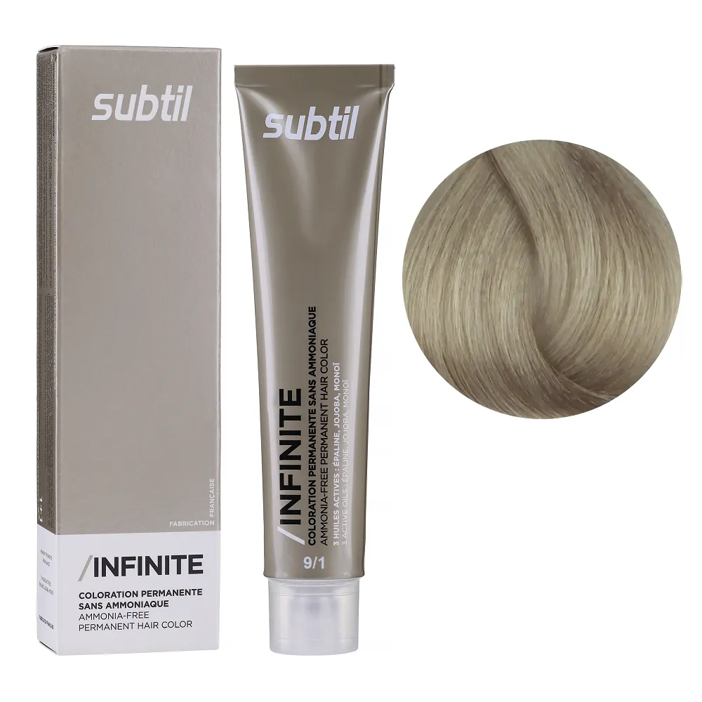 Subtil Infinite - фарба без вмісту аміаку нового покоління, що містить щонайменше 78% інгредієнтів природного походження та трилогію дорогоцінних олій: жожоба, моної, кукурудзяної. Забезпечує 100% зафарбовування сивини, супер блиск та супер стійкість. Безаміачна фарба додає волоссю стійкий і насичений колір, при цьому не ушкоджує і не висушує його. Олії, що входять до складу зволожують і ущільнюють волосся, роблять його блискучим і шовковистим. Щадна формула підходить навіть власницям чутливої шкіри голови. Так само фарба здатна освітлити волосся до трьох рівнів, що є революцією в світі безаміачних фарб. Розкішний колір, гладкість і здоровий блиск без шкоди для волосся. Застосування: 9/1 дуже світлий блондин попелястий Безаміачна стійка крем-фарба для волосся, 60 мл Permanent Hair Color INFINITE SUBTIL Крем-фарбу потрібно наносити на брудне сухе волосся. Фарбу слід змивати ретельно до повної прозорості води. Час витримки: 9/1 дуже світлий блондин попелястий Безаміачна стійка крем-фарба для волосся, 60 мл Permanent Hair Color INFINITE SUBTIL Витримати на волоссі від 30 до 35 хвилин, при наявності сивого волосся час впливу можна збільшити на 10 хвилин. Застосовувати фарбу слід, суворо дотримуючись інструкції, яка додається до кожної упаковки.Безаміачна стійка крем-фарба для волосся Permanent Hair Color INFINITE SUBTIL