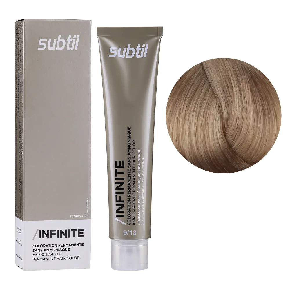 Subtil Infinite - фарба без вмісту аміаку нового покоління, що містить щонайменше 78% інгредієнтів природного походження та трилогію дорогоцінних олій: жожоба, моної, кукурудзяної. Забезпечує 100% зафарбовування сивини, супер блиск та супер стійкість. Безаміачна фарба додає волоссю стійкий і насичений колір, при цьому не ушкоджує і не висушує його. Олії, що входять до складу зволожують і ущільнюють волосся, роблять його блискучим і шовковистим. Щадна формула підходить навіть власницям чутливої шкіри голови. Так само фарба здатна освітлити волосся до трьох рівнів, що є революцією в світі безаміачних фарб. Розкішний колір, гладкість і здоровий блиск без шкоди для волосся. Застосування: 9/13 дуже світлий блондин попелястий золотистий Безаміачна стійка крем-фарба для волосся, 60 мл Permanent Hair Color INFINITE SUBTIL Крем-фарбу потрібно наносити на брудне сухе волосся. Фарбу слід змивати ретельно до повної прозорості води. Час витримки: 9/13 дуже світлий блондин попелястий золотистий Безаміачна стійка крем-фарба для волосся, 60 мл Permanent Hair Color INFINITE SUBTIL Витримати на волоссі від 30 до 35 хвилин, при наявності сивого волосся час впливу можна збільшити на 10 хвилин. Застосовувати фарбу слід, суворо дотримуючись інструкції, яка додається до кожної упаковки.Безаміачна стійка крем-фарба для волосся Permanent Hair Color INFINITE SUBTIL