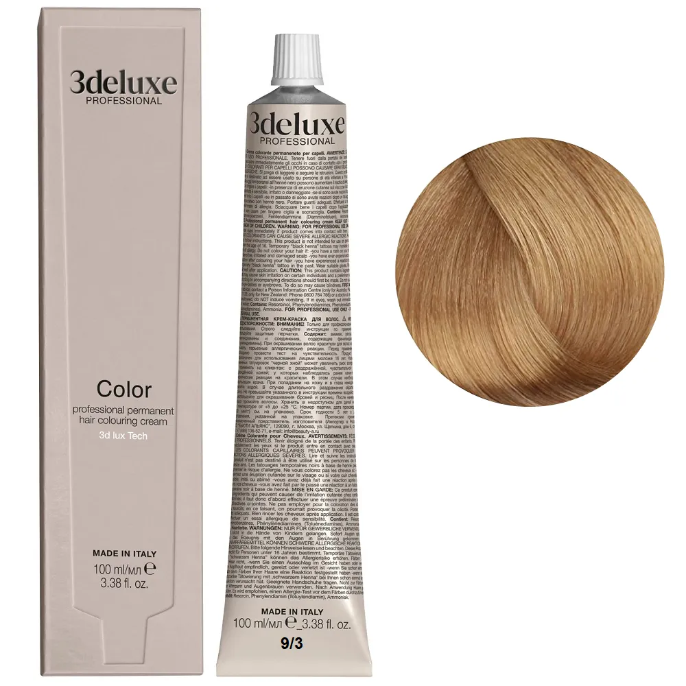 Професійна стійка кремова фарба для волосся Permanent Hair Color 3deluxe з неймовірним відбиттям світла та чудовим захистом, забезпечує волоссю неперевершену якість. Містить технологію 3D Lux, яка забезпечує насичений, яскравий, багатогранний колір: Особливості продукту: 9/3 дуже світлий блондин золотистий Фарба для волосся, 100 мл Permanent Hair Color 3deluxe Professional Активні компоненти: 9/3 дуже світлий блондин золотистий Фарба для волосся, 100 мл Permanent Hair Color 3deluxe Professional Застосування: 9/3 дуже світлий блондин золотистий Фарба для волосся, 100 мл Permanent Hair Color 3deluxe Professional Змішайте в пластмасовому посуді крему-фарбу Color 3deluxe з кремом-окислювачем 1,5%, 3%, 6%, 9% або 12%. Пропорції змішування: для основної палітри відтінків - 1:1,5, для освітлювального ряду - 1:2, для більш насиченого кольору - 1:1. Час витримки залежить від бажаного результату. Важливо! Продукт для професійного застосування. Уважно ознайомтесь з інструкцією.Фарба для волосся Permanent Hair Color 3deluxe Professional
