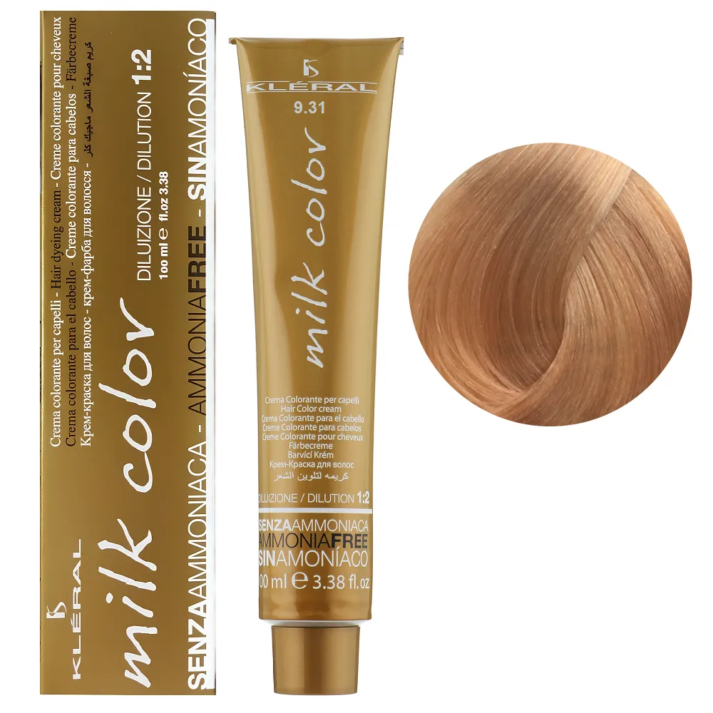 Безаміачна фарба Milk Color, розроблена італійською компанією Kleral System, представлена більше ніж 40 відтінками. Прекрасно забарвлює волосся, у тому числі і сиве (якщо сивини не більше 50%) у близькі до натуральних кольорів. Завдяки своєму щадному складу і компонентам, що доглядають, не пошкоджує структуру волосся, надає їм блиск і м`якість. Milk Color ідеально підходить для пошкодженого волосся. Тюбик містить 100 мл фарби та розрахований на 2 повні нанесення. Рекомендований окислювач - 20-vol стабілізований перекис водню. Для збільшення освітлювальної дії, використовуйте стабілізований перекис водню в 30- або 40-vol емульсії. Особливості продукту: 9/31 Бежевий дуже світлий блонд Крем-фарба для волосся перманентна без аміаку, 100 мл Milk Color KLERAL System Застосування: 9/31 Бежевий дуже світлий блонд Крем-фарба для волосся перманентна без аміаку, 100 мл Milk Color KLERAL System Продукт призначений для професійного використання. Уважно ознайомтесь з інструкцією.Крем-фарба для волосся перманентна без аміаку Milk Color KLERAL System