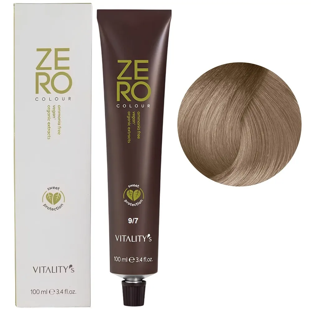 Zero Colour – це веганська фарба з високим натуральним індексом, зі зниженим ризиком подразнення та алергії. Завдяки антиоксидантним та пом`якшувальним властивостям, вона допомагає захистити колір та робить волосся м`яким і шовковистим. Формула без аміаку делікатно відновлює волосся для багатогранного, насиченого та сяючого кольору. Здатна задовольнити бажання кольору всіх жінок, навіть тих, хто має проблеми з чутливістю шкіри. Результат зберігається до 6 тижнів. Зменшуються подразнення та сухість шкіри голови, покращується загальний стан волосся після фарбування. Особливості продукту: 9/7 дуже світлий блондин перлинний Крем-фарба для волосся без аміаку, 100 мл ZERO VEGAN Vitality`s Застосування: 9/7 дуже світлий блондин перлинний Крем-фарба для волосся без аміаку, 100 мл ZERO VEGAN Vitality`s Важливо! Продукт для професійного застосування. Уважно ознайомтесь з інструкцією..Крем-фарба для волосся без аміаку ZERO VEGAN Vitality`s